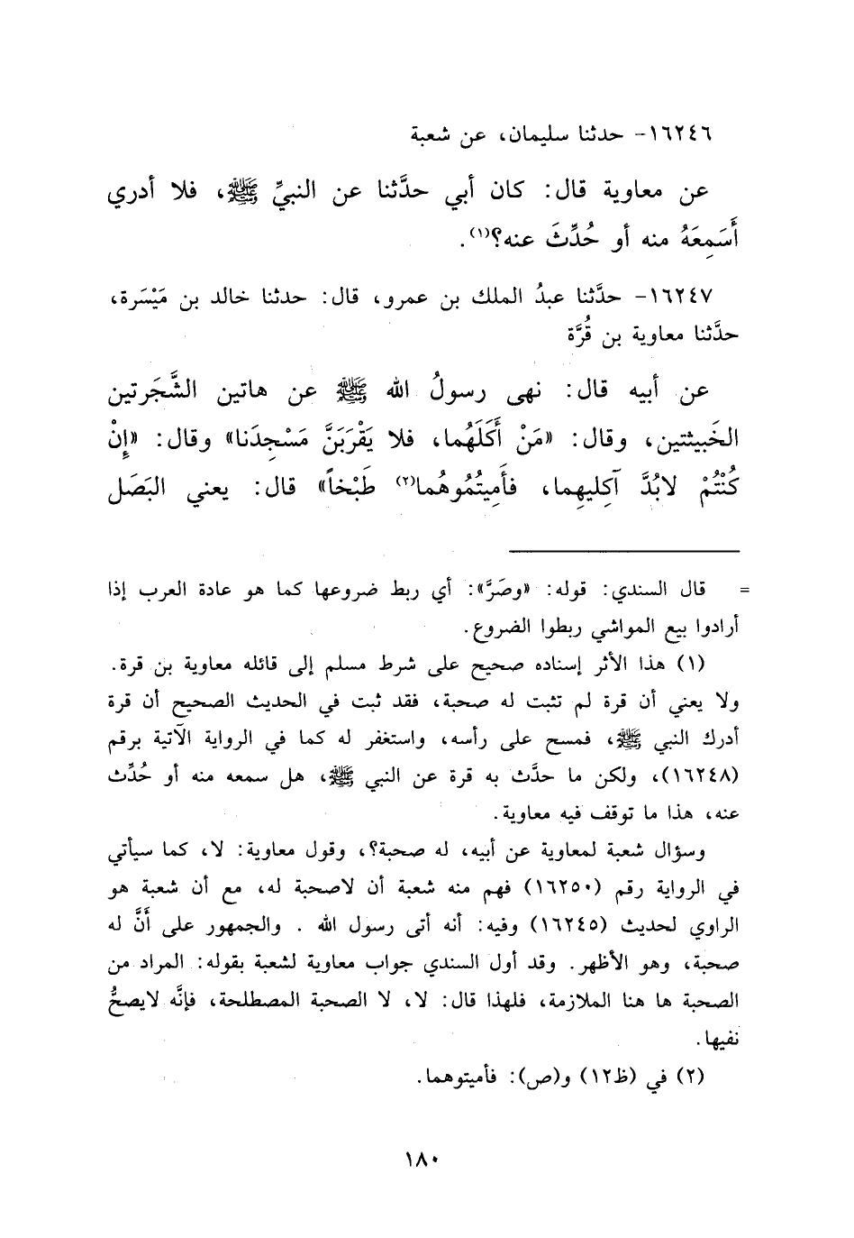 ولا يعني أن قرة لم تثبت له صحبة، فقد ثبت في الحديث الصحيح أن قرة أدرك النبي صَلَّى اللهُ عَلَيْهِ وَسَلَّمَ، فمسح على رأسه، واستغفر له كما في الرواية الآتية برقم (١٦٢٤٨) ، ولكن ما حدََّث به قرة عن النبي صَلَّى اللهُ عَلَيْهِ وَسَلَّمَ، هل سمعه منه أو حُدِّث عنه، هذا ما توقف فيه معاوية.