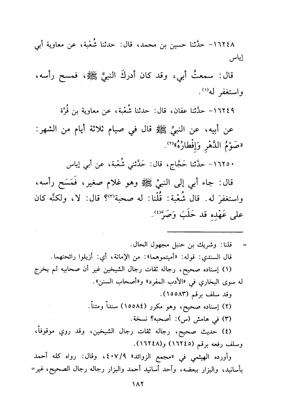 ١٦٢٤٨ - حَدَّثَنَا حُسَيْنُ بْنُ مُحَمَّدٍ، قَالَ: حَدَّثَنَا شُعْبَةُ، عَنْ مُعَاوِيَةَ أَبِي إِيَاسٍ، قَالَ: سَمِعْتُ أَبِي وَقَدْ كَانَ أَدْرَكَ النَّبِيَّ صَلَّى اللهُ عَلَيْهِ وَسَلَّمَ " فَمَسَحَ رَأْسَهُ وَاسْتَغْفَرَ لَهُ " (١)