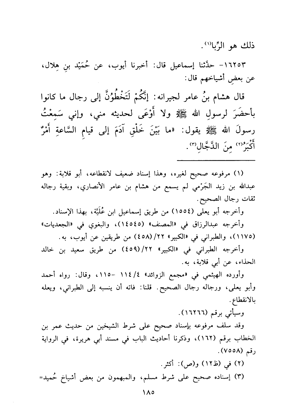 ١٦٢٥٣ - حَدَّثَنَا إِسْمَاعِيلُ، قَالَ: أَخْبَرَنَا أَيُّوبُ، عَنْ حُمَيْدِ بْنِ هِلَالٍ، عَنْ بَعْضِ أَشْيَاخِهِمْ، قَالَ: قَالَ هِشَامُ بْنُ عَامِرٍ لِجِيرَانِهِ: إِنَّكُمْ لَتَخُطُّونَ إِلَى رِجَالٍ مَا كَانُوا بِأَحْضَرَ لِرَسُولِ اللهِ صَلَّى اللهُ عَلَيْهِ وَسَلَّمَ، وَلَا أَوْعَى لِحَدِيثِهِ مِنِّي، وَإِنِّي سَمِعْتُ رَسُولَ اللهِ صَلَّى اللهُ عَلَيْهِ وَسَلَّمَ يَقُولُ: " مَا بَيْنَ خَلْقِ آدَمَ إِلَى قِيَامِ السَّاعَةِ، أَمْرٌ أَكْبَرُ (٢) مِنَ الدَّجَّالِ " (٣)