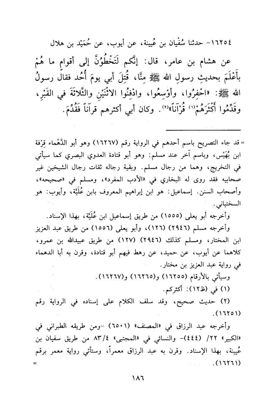 ١٦٢٥٤ - حَدَّثَنَا سُفْيَانُ بْنُ عُيَيْنَةَ، عَنْ أَيُّوبَ، عَنْ حُمَيْدِ بْنِ هِلَالٍ، عَنْ هِشَامِ بْنِ عَامِرٍ، قَالَ: إِنَّكُمْ لَتَخُطُّونَ إِلَى أَقْوَامٍ مَا هُمْ بِأَعْلَمَ بِحَدِيثِ رَسُولِ اللهِ صَلَّى اللهُ عَلَيْهِ وَسَلَّمَ مِنَّا، قُتِلَ أَبِي يَوْمَ أُحُدٍ، فَقَالَ رَسُولُ اللهِ صَلَّى اللهُ عَلَيْهِ وَسَلَّمَ: " احْفِرُوا وَأَوْسِعُوا وَادْفِنُوا الِاثْنَيْنِ، وَالثَّلَاثَةَ فِي الْقَبْرِ، وَقَدِّمُوا أَكْثَرَهُمْ (١) قُرْآنًا "، (٢) وَكَانَ أَبِي أَكْثَرَهُمْ قُرْآنًا فَقُدِّمَ