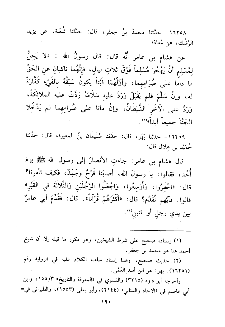 ١٦٢٥٨ - حَدَّثَنَا مُحَمَّدُ بْنُ جَعْفَرٍ، قَالَ: حَدَّثَنَا شُعْبَةُ، عَنْ يَزِيدَ الرِّشْكِ، عَنْ مُعَاذَةَ، عَنْ هِشَامِ بْنِ عَامِرٍ، أَنَّهُ قَالَ: قَالَ رَسُولُ اللهِ صَلَّى اللهُ عَلَيْهِ وَسَلَّمَ: " لَا يَحِلُّ لِمُسْلِمٍ أَنْ يَهْجُرَ مُسْلِمًا فَوْقَ ثَلَاثِ لَيَالٍ، فَإِنَّهُمَا نَاكِبَانِ عَنِ الْحَقِّ، مَا دَامَا عَلَى صُرَامِهِمَا، وَأَوَّلُهُمَا فَيْئًا يَكُونُ سَبْقُهُ بِالْفَيْءِ كَفَّارَةً لَهُ، وَإِنْ سَلَّمَ فَلَمْ يَقْبَلْ وَرَدَّ عَلَيْهِ سَلَامَهُ، رَدَّتْ عَلَيْهِ الْمَلَائِكَةُ، وَرَدَّ عَلَى الْآخَرِ الشَّيْطَانُ، وَإِنْ مَاتَا عَلَى صُرَامِهِمَا لَمْ يَدْخُلَا الْجَنَّةَ جَمِيعًا أَبَدًا " (١)