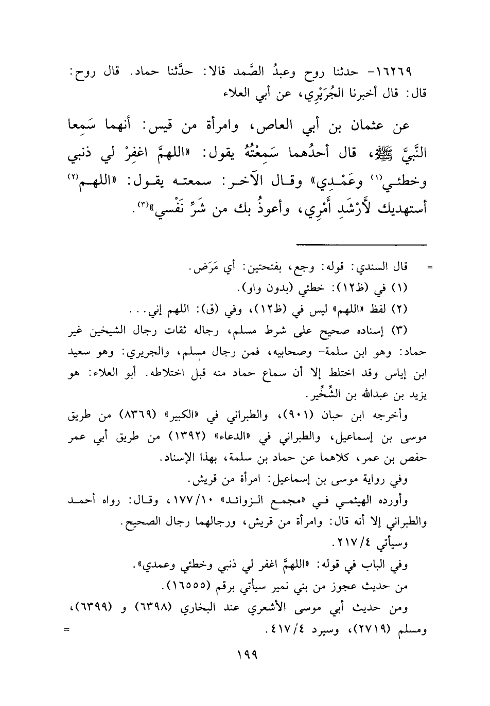 ١٦٢٦٩ - حَدَّثَنَا رَوْحٌ، وَعَبْدُ الصَّمَدِ، قَالَا: حَدَّثَنَا حَمَّادٌ، قَالَ رَوْحٌ: قَالَ: أَخْبَرَنَا الْجُرَيْرِيُّ، عَنْ أَبِي الْعَلَاءِ، عَنْ عُثْمَانَ بْنِ أَبِي الْعَاصِ، وَامْرَأَةٍ، مِنْ قَيْسٍ أَنَّهُمَا سَمِعَا النَّبِيَّ صَلَّى اللهُ عَلَيْهِ وَسَلَّمَ، قَالَ أَحَدُهُمَا: سَمِعْتُهُ يَقُولُ: " اللهُمَّ اغْفِرْ لِي ذَنْبِي وَخَطَئِي (١) وَعَمْدِي " وقَالَ الْآخَرُ: سَمِعْتُهُ يَقُولُ: " اللهُمَّ (٢) أَسْتَهْدِيكَ لِأَرْشَدِ أَمْرِي، وَأَعُوذُ بِكَ مِنْ شَرِّ نَفْسِي " (٣)