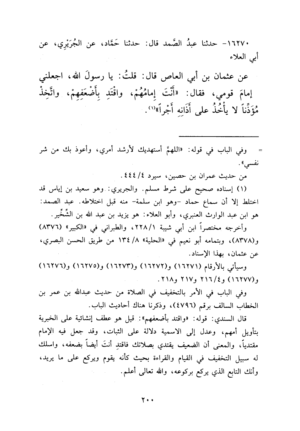 ١٦٢٧٠ - حَدَّثَنَا عَبْدُ الصَّمَدِ، قَالَ: حَدَّثَنَا حَمَّادٌ، عَنِ الْجُرَيْرِيِّ، عَنْ أَبِي الْعَلَاءِ، عَنْ عُثْمَانَ بْنِ أَبِي الْعَاصِ، قَالَ: قُلْتُ: يَا رَسُولَ اللهِ، اجْعَلْنِي إِمَامَ قَوْمِي، فَقَالَ: " أَنْتَ إِمَامُهُمْ وَاقْتَدِ بِأَضْعَفِهِمْ، وَاتَّخِذْ مُؤَذِّنًا لَا يَأْخُذُ عَلَى أَذَانِهِ أَجْرًا " (١)