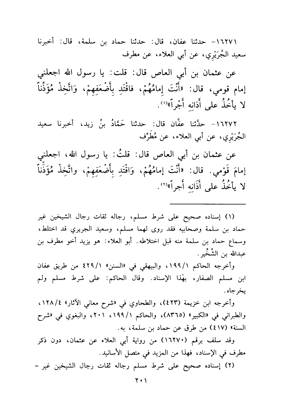 ١٦٢٧٢ - حَدَّثَنَا عَفَّانُ، قَالَ: حَدَّثَنَا حَمَّادُ بْنُ زَيْدٍ، أَخْبَرَنَا سَعِيدٌ الْجُرَيْرِيُّ، عَنْ أَبِي الْعَلَاءِ، عَنْ مُطَرِّفٍ، عَنْ عُثْمَانَ بْنِ أَبِي الْعَاصِ، قَالَ: قُلْتُ: يَا رَسُولَ اللهِ، اجْعَلْنِي إِمَامَ قَوْمِي، قَالَ: " أَنْتَ إِمَامُهُمْ وَاقْتَدِ بِأَضْعَفِهِمْ، وَاتَّخِذْ مُؤَذِّنًا لَا يَأْخُذُ عَلَى أَذَانِهِ أَجْرًا " (٢)