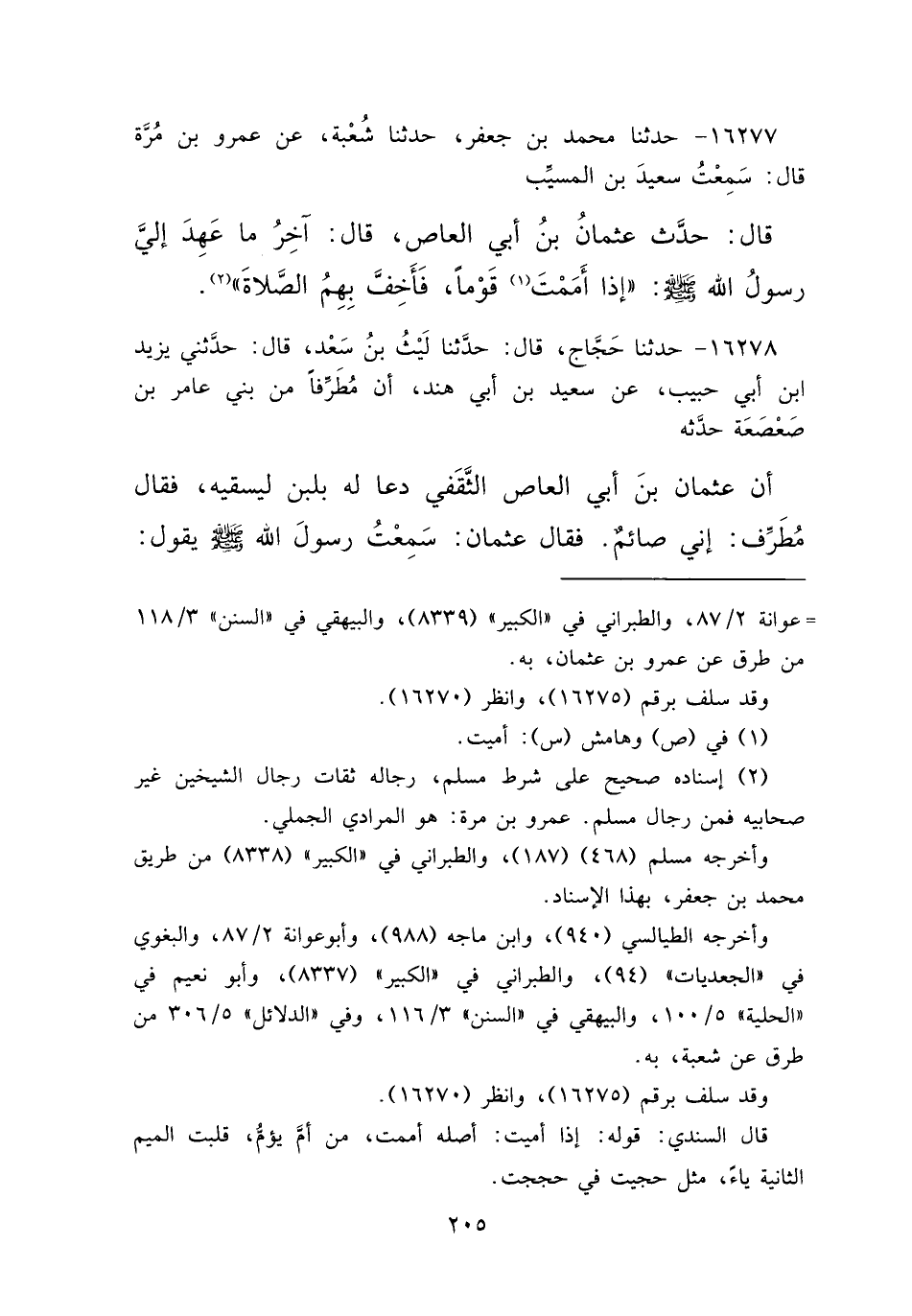 ١٦٢٧٧ - حَدَّثَنَا مُحَمَّدُ بْنُ جَعْفَرٍ، حَدَّثَنَا شُعْبَةُ، عَنْ عَمْرِو بْنِ مُرَّةَ، قَالَ: سَمِعْتُ سَعِيدَ بْنَ الْمُسَيِّبِ، قَالَ: حَدَّثَ عُثْمَانُ بْنُ أَبِي الْعَاصِ، قَالَ: آخِرُ مَا عَهِدَ إِلَيَّ رَسُولُ اللهِ صَلَّى اللهُ عَلَيْهِ وَسَلَّمَ: " إِذَا أَمَمْتَ (١) قَوْمًا فَأَخِفَّ بِهِمُ الصَّلَاةَ " (٢)