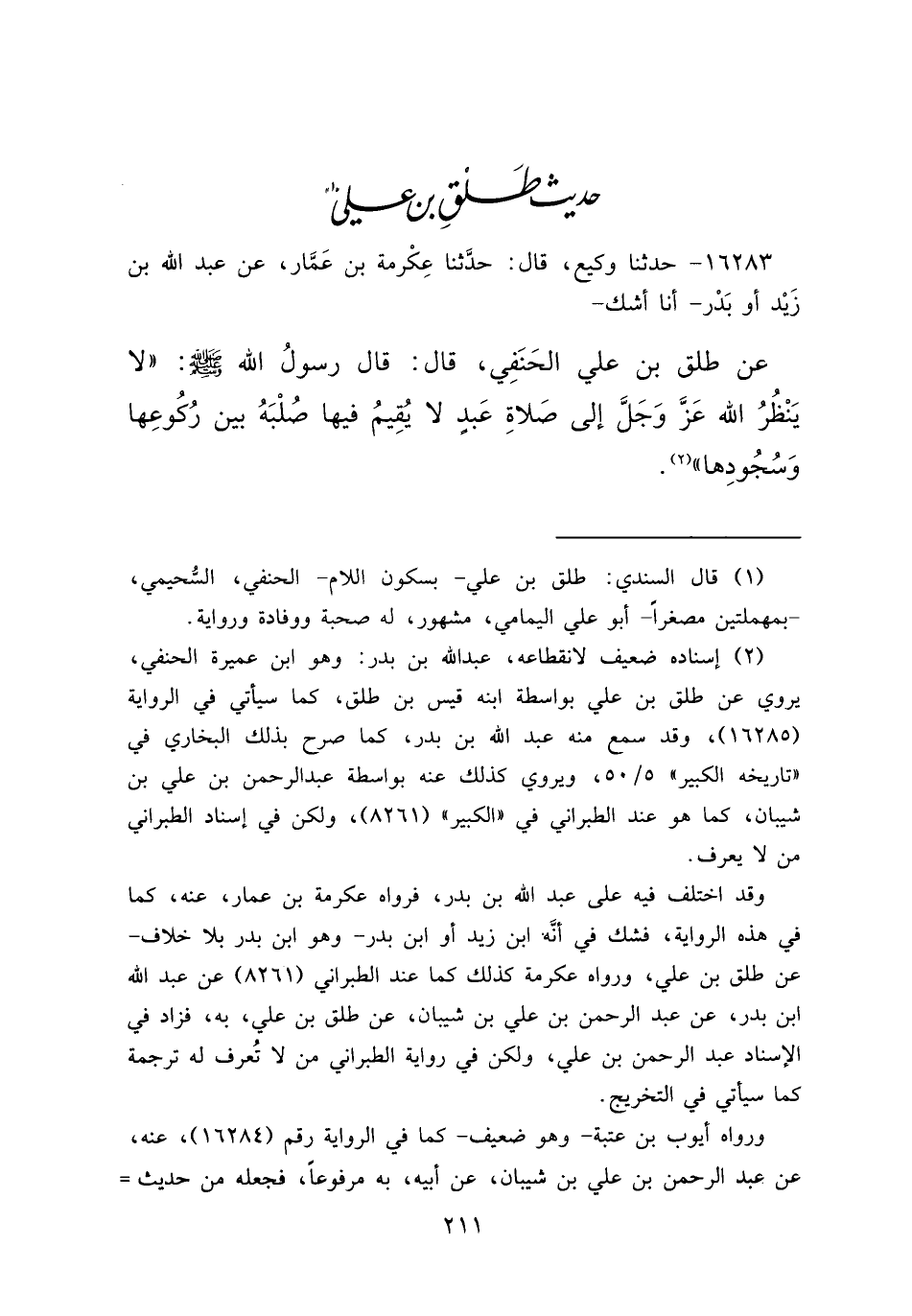 ١٦٢٨٣ - حَدَّثَنَا وَكِيعٌ، قَالَ: حَدَّثَنَا عِكْرِمَةُ بْنُ عَمَّارٍ، عَنْ عَبْدِ اللهِ بْنِ زَيْدٍ، أَوْ بَدْرٍ ـ أَنَا أَشُكُّ ـ عَنْ طَلْقِ بْنِ عَلِيٍّ الْحَنَفِيِّ قَالَ: قَالَ رَسُولُ اللهِ صَلَّى اللهُ عَلَيْهِ وَسَلَّمَ: " لَا يَنْظُرُ اللهُ عَزَّ وَجَلَّ إِلَى صَلَاةِ عَبْدٍ لَا يُقِيمُ فِيهَا صُلْبَهُ بَيْنَ رُكُوعِهَا وَسُجُودِهَا " (٢)