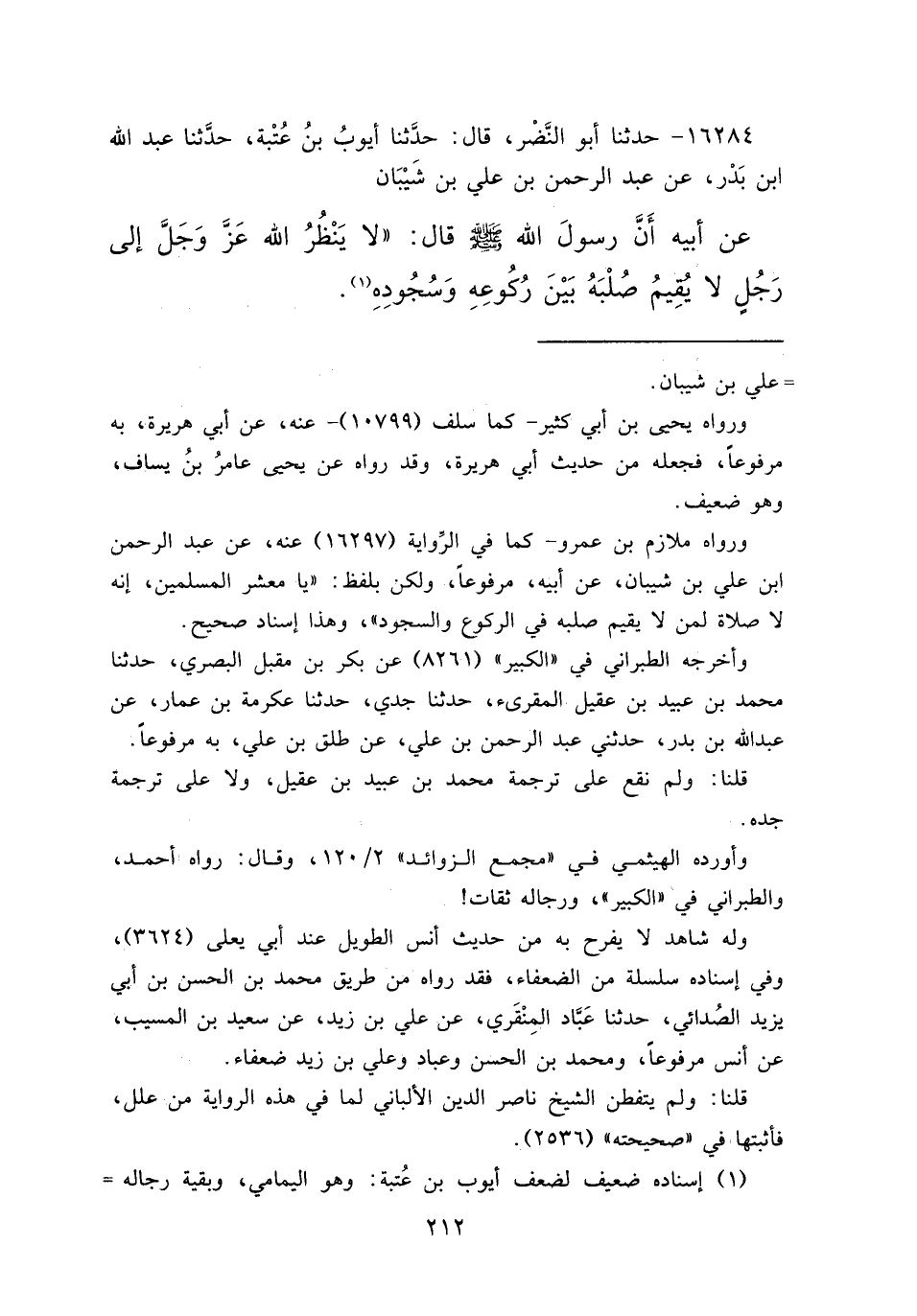 ١٦٢٨٤ - حَدَّثَنَا أَبُو النَّضْرِ، قَالَ: حَدَّثَنَا أَيُّوبُ بْنُ عُتْبَةَ، حَدَّثَنَا عَبْدُ اللهِ بْنُ بَدْرٍ، عَنْ عَبْدِ الرَّحْمَنِ بْنِ عَلِيِّ بْنِ شَيْبَانَ، عَنْ أَبِيهِ، أَنَّ رَسُولَ اللهِ صَلَّى اللهُ عَلَيْهِ وَسَلَّمَ قَالَ: " لَا يَنْظُرُ اللهُ عَزَّ وَجَلَّ إِلَى رَجُلٍ لَا يُقِيمُ صُلْبَهُ بَيْنَ رُكُوعِهِ وَسُجُودِهِ " (١)