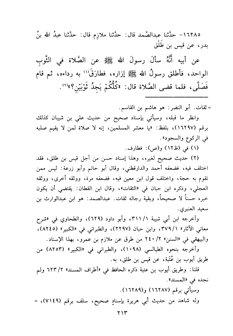 ١٦٢٨٥ - حَدَّثَنَا عَبْدُ الصَّمَدِ، قَالَ: حَدَّثَنَا مُلَازِمٌ، قَالَ: حَدَّثَنَا عَبْدُ اللهِ بْنُ بَدْرٍ، عَنْ قَيْسِ بْنِ طَلْقٍ، عَنْ أَبِيهِ، أَنَّهُ سَأَلَ رَسُولَ اللهِ صَلَّى اللهُ عَلَيْهِ وَسَلَّمَ عَنِ الصَّلَاةِ فِي الثَّوْبِ الْوَاحِدِ، فَأَطْلَقَ رَسُولُ اللهِ صَلَّى اللهُ عَلَيْهِ وَسَلَّمَ إِزَارَهُ، فَطَارَقَ (١) بِهِ رِدَاءَهُ، ثُمَّ قَامَ فَصَلَّى، فَلَمَّا قَضَى الصَّلَاةَ قَالَ: " كُلُّكُمْ يَجِدُ ثَوْبَيْنِ؟ " (٢)