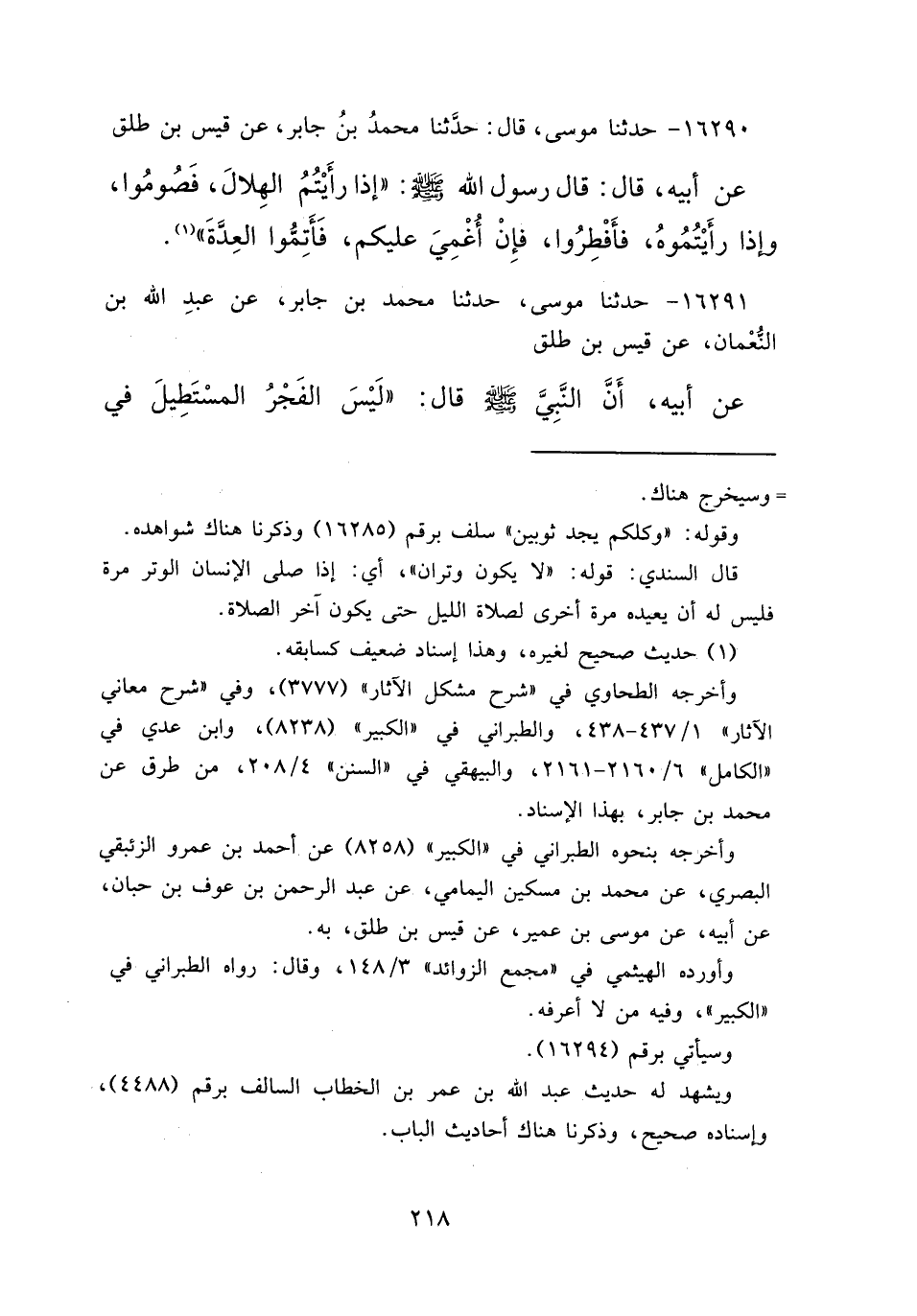 ١٦٢٩٠ - حَدَّثَنَا مُوسَى، قَالَ: حَدَّثَنَا مُحَمَّدُ بْنُ جَابِرٍ، عَنْ قَيْسِ بْنِ طَلْقٍ، عَنْ أَبِيهِ قَالَ: قَالَ رَسُولُ اللهِ صَلَّى اللهُ عَلَيْهِ وَسَلَّمَ: " إِذَا رَأَيْتُمُ الْهِلَالَ فَصُومُوا، وَإِذَا رَأَيْتُمُوهُ فَأَفْطِرُوا، فَإِنْ أُغْمِيَ عَلَيْكُمْ فَأَتِمُّوا الْعِدَّةَ " (١)