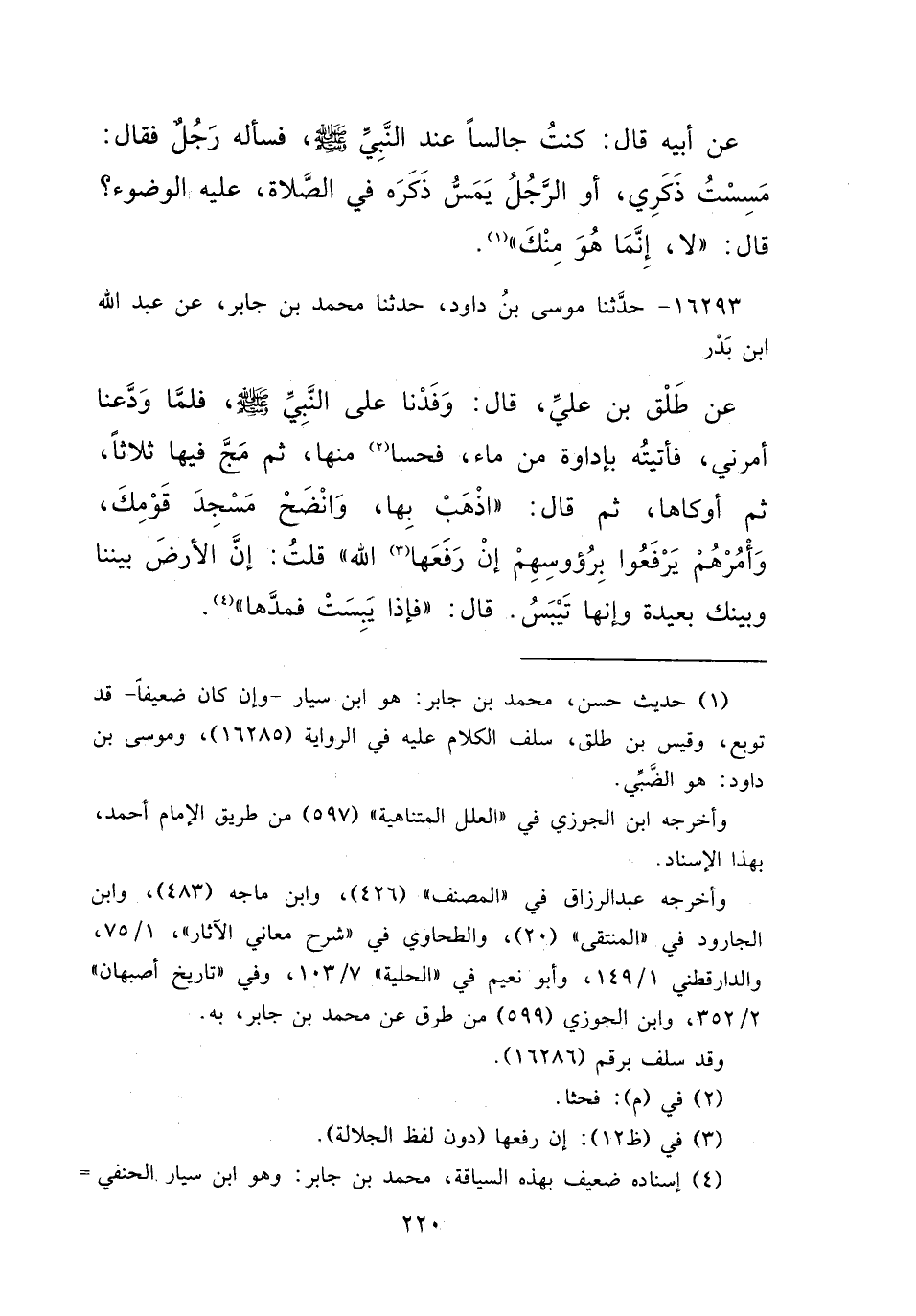عَنْ أَبِيهِ قَالَ: كُنْتُ جَالِسًا عِنْدَ النَّبِيِّ صَلَّى اللهُ عَلَيْهِ وَسَلَّمَ فَسَأَلَهُ رَجُلٌ فَقَالَ: مَسِسْتُ ذَكَرِي أَوِ الرَّجُلُ يَمَسُّ ذَكَرَهُ فِي الصَّلَاةِ عَلَيْهِ الْوُضُوءُ؟ قَالَ: " لَا إِنَّمَا هُوَ مِنْكَ " (١)