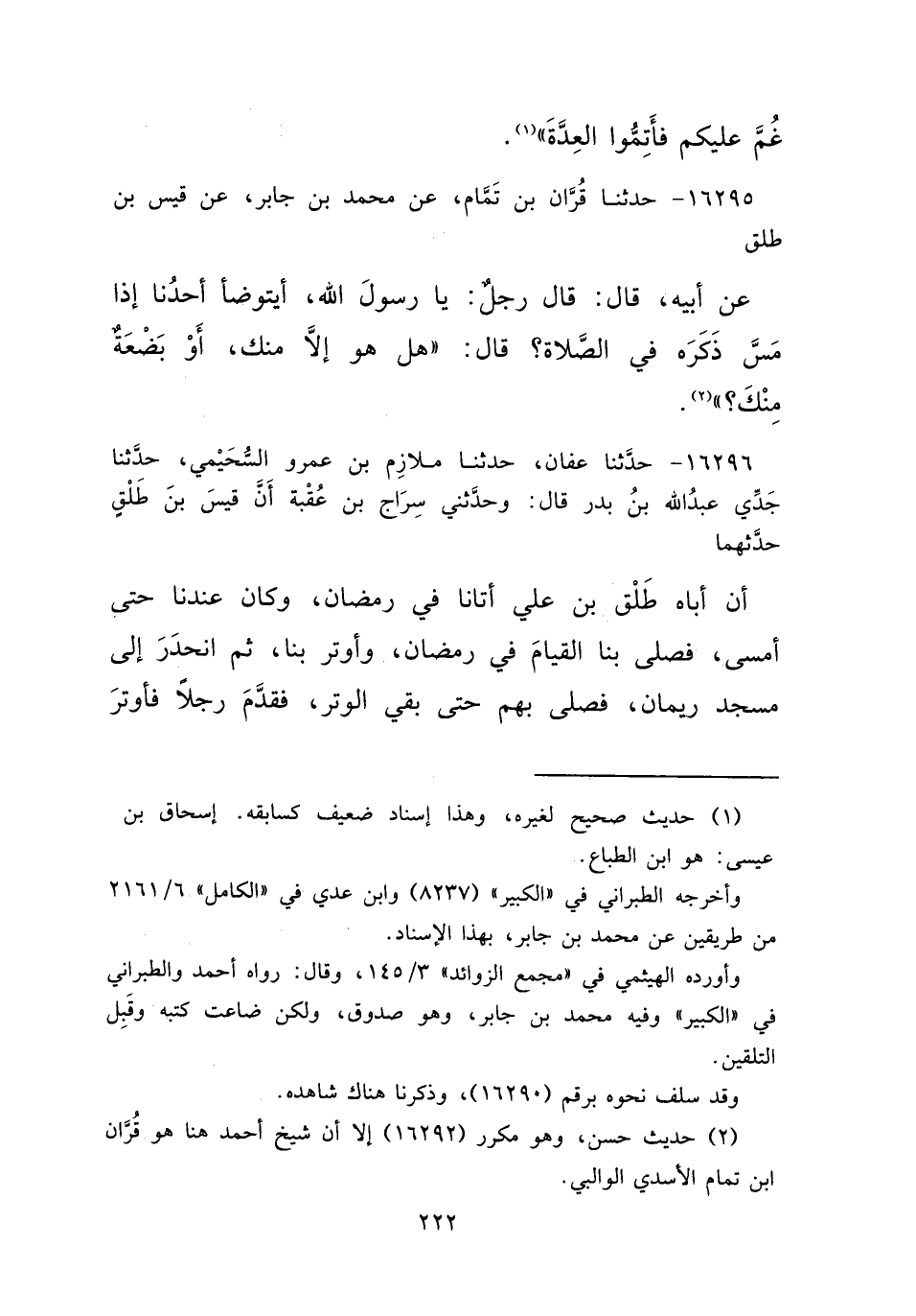 ١٦٢٩٥ - حَدَّثَنَا قُرَّانُ بْنُ تَمَّامٍ، عَنْ مُحَمَّدِ بْنِ جَابِرٍ، عَنْ قَيْسِ بْنِ طَلْقٍ، عَنْ أَبِيهِ قَالَ: قَالَ رَجُلٌ: يَا رَسُولَ اللهِ، أَيَتَوَضَّأُ أَحَدُنَا إِذَا مَسَّ ذَكَرَهُ فِي الصَّلَاةِ؟ قَالَ: " هَلْ هُوَ إِلَّا مِنْكَ، أَوْ بَضْعَةٌ مِنْكَ؟ " (٢)