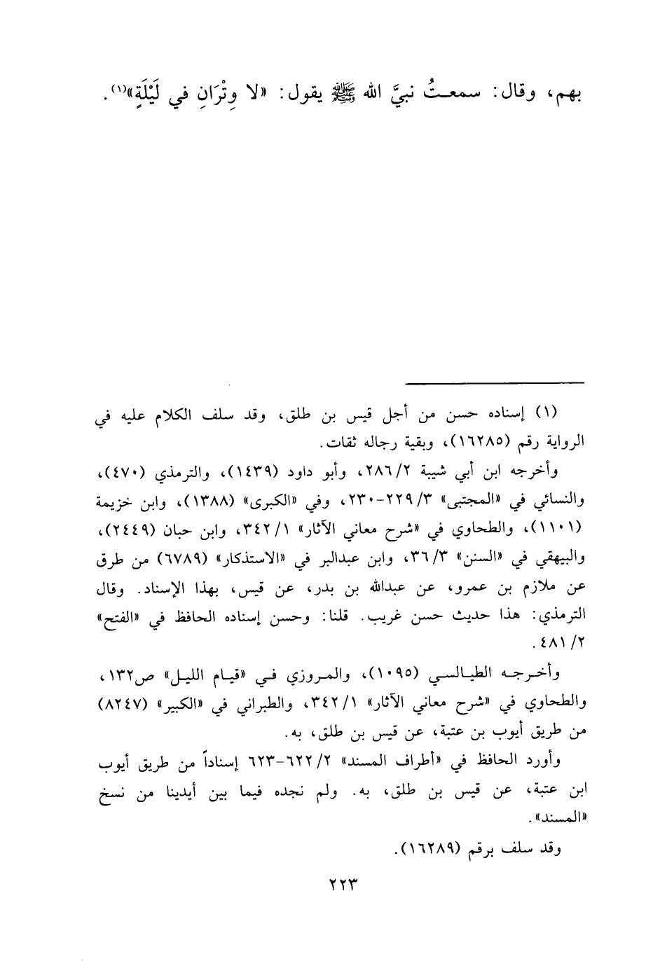 بِهِمْ وَقَالَ: سَمِعْتُ نَبِيَّ اللهِ صَلَّى اللهُ عَلَيْهِ وَسَلَّمَ يَقُولُ: " لَا وِتْرَانِ فِي لَيْلَةٍ " (١)