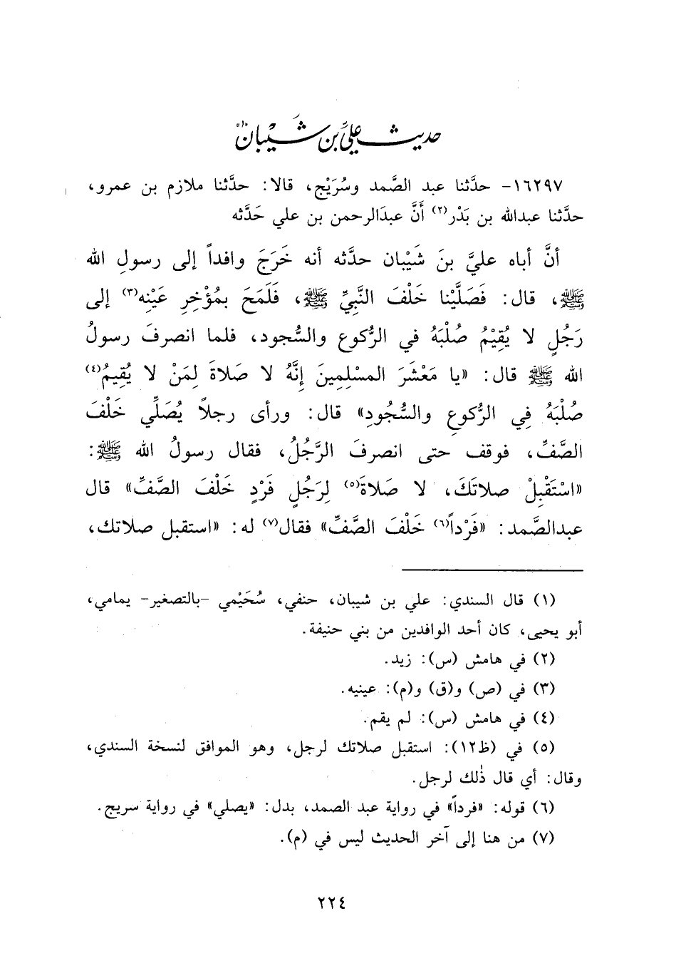 ١٦٢٩٧ - حَدَّثَنَا عَبْدُ الصَّمَدِ، وَسُرَيْجٌ، قَالَا: حَدَّثَنَا مُلَازِمُ بْنُ عَمْرٍو، حَدَّثَنَا عَبْدُ اللهِ بْنُ بَدْرٍ، (٢) أَنَّ عَبْدَ الرَّحْمَنِ بْنَ عَلِيٍّ حَدَّثَهُ، أَنَّ أَبَاهُ عَلِيَّ بْنَ شَيْبَانَ حَدَّثَهُ، أَنَّهُ خَرَجَ وَافِدًا إِلَى رَسُولِ اللهِ صَلَّى اللهُ عَلَيْهِ وَسَلَّمَ قَالَ: فَصَلَّيْنَا خَلْفَ النَّبِيِّ صَلَّى اللهُ عَلَيْهِ وَسَلَّمَ، فَلَمَحَ بِمُؤْخِرِ عَيْنِهِ (٣) إِلَى رَجُلٍ لَا يُقِيمُ صُلْبَهُ فِي الرُّكُوعِ وَالسُّجُودِ، فَلَمَّا انْصَرَفَ رَسُولُ اللهِ صَلَّى اللهُ عَلَيْهِ وَسَلَّمَ قَالَ: " يَا مَعْشَرَ الْمُسْلِمِينَ، إِنَّهُ لَا صَلَاةَ لِمَنْ لَا يُقِيمُ (٤) صُلْبَهُ فِي الرُّكُوعِ وَالسُّجُودِ "