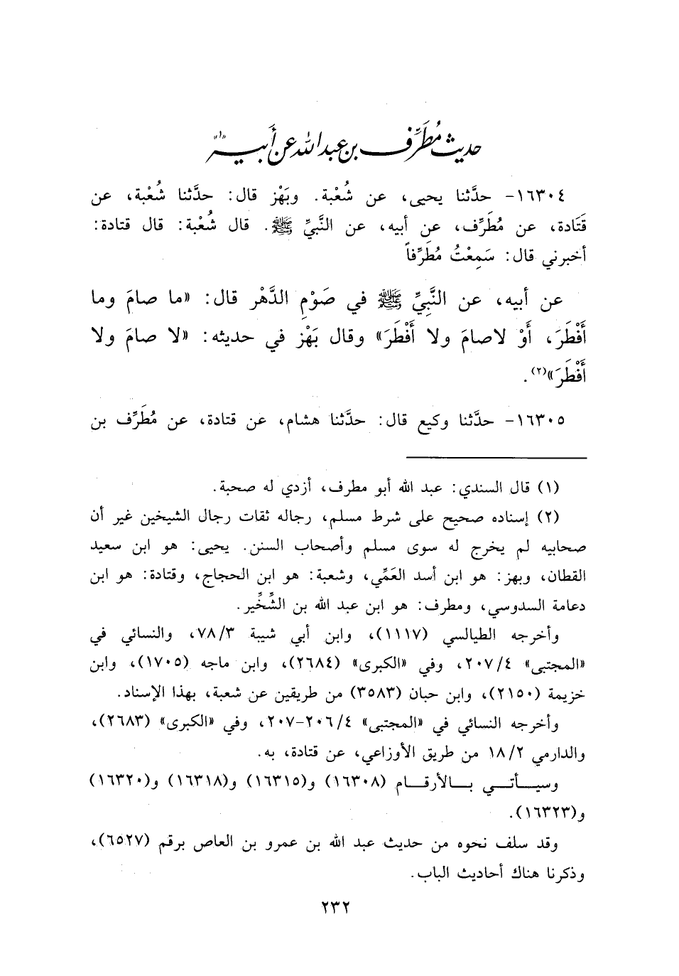 (٢) إسناده صحيح على شرط مسلم، رجاله ثقات رجال الشيخين غير أن صحابيه لم يخرج له سوى مسلم وأصحاب السنن. يحيى: هو ابن سعيد القطان، وبهز: هو ابن أسد العَمَي، وشعبة: هو ابن الحجاج، وقتادة: هو ابن دعامة السدوسي، ومطرف: هو ابن عبد الله بن الشِّخِّير.
