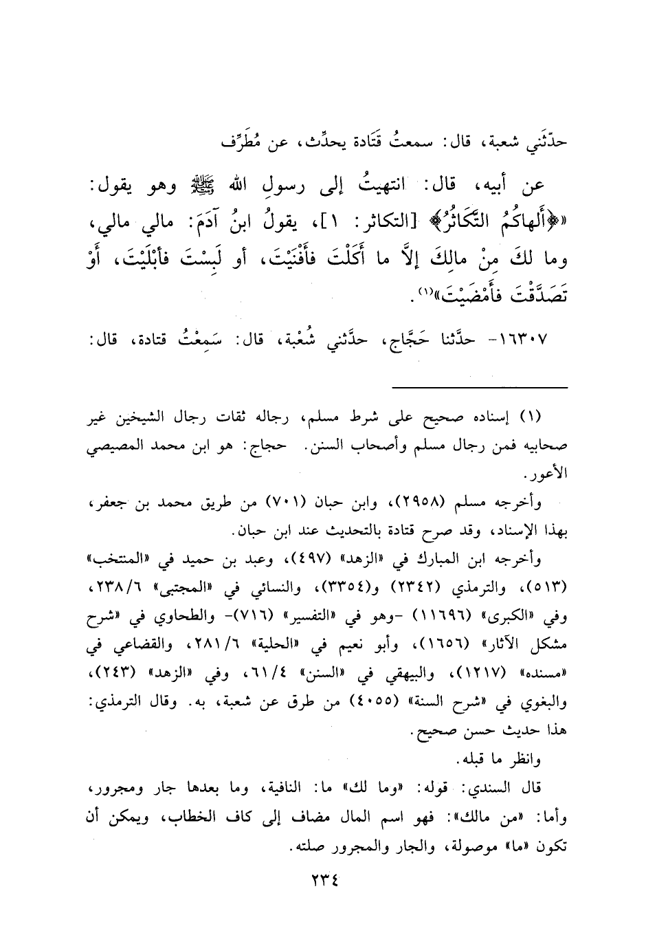 حَدَّثَنِي شُعْبَةُ، قَالَ: سَمِعْتُ قَتَادَةَ يُحَدِّثُ، عَنْ مُطَرِّفٍ، عَنْ أَبِيهِ قَالَ: انْتَهَيْتُ إِلَى رَسُولِ اللهِ صَلَّى اللهُ عَلَيْهِ وَسَلَّمَ وَهُوَ يَقُولُ: " {أَلْهَاكُمُ التَّكَاثُرُ} [التكاثر: ١] ، يَقُولُ ابْنُ آدَمَ: مَالِي مَالِي، وَمَا لَكَ مِنْ مَالِكَ إِلَّا مَا أَكَلْتَ فَأَفْنَيْتَ، أَوْ لَبِسْتَ فَأَبْلَيْتَ، أَوْ تَصَدَّقْتَ فَأَمْضَيْتَ " (١)