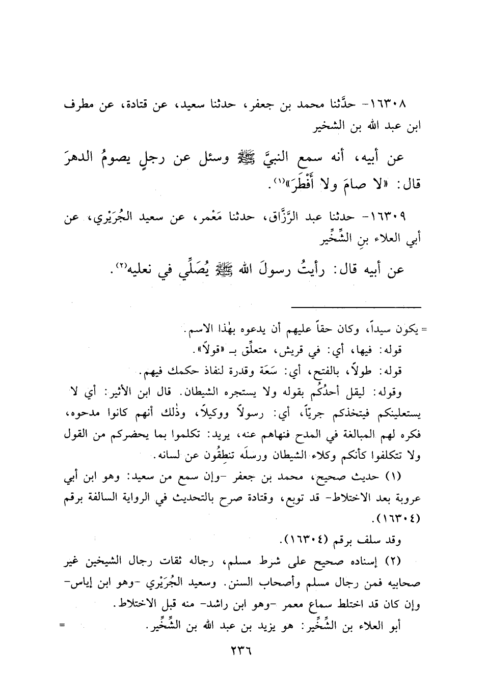 ١٦٣٠٩ - حَدَّثَنَا عَبْدُ الرَّزَّاقِ، حَدَّثَنَا مَعْمَرٌ، عَنْ سَعِيدٍ الْجُرَيْرِيِّ، عَنْ أَبِي الْعَلَاءِ بْنِ الشِّخِّيرِ، عَنْ أَبِيهِ قَالَ: " رَأَيْتُ رَسُولَ اللهِ صَلَّى اللهُ عَلَيْهِ وَسَلَّمَ يُصَلِّي فِي نَعْلَيْهِ " (٢)