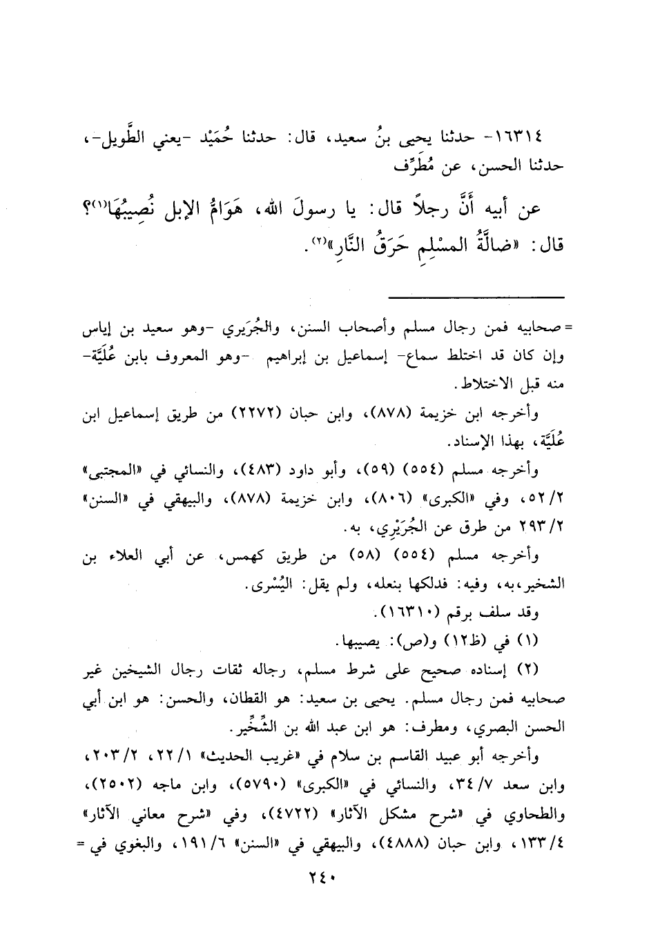 ١٦٣١٤ - حَدَّثَنَا يَحْيَى بْنُ سَعِيدٍ، قَالَ: حَدَّثَنَا حُمَيْدٌ يَعْنِي الطَّوِيلَ، حَدَّثَنَا الْحَسَنُ، عَنْ مُطَرِّفٍ، عَنْ أَبِيهِ، أَنَّ رَجُلًا قَالَ: يَا رَسُولَ اللهِ، هَوَامَّ الْإِبِلِ نُصِيبُهَا (١) ؟ قَالَ: " ضَالَّةُ الْمُسْلِمِ حَرَقُ النَّارِ " (٢)