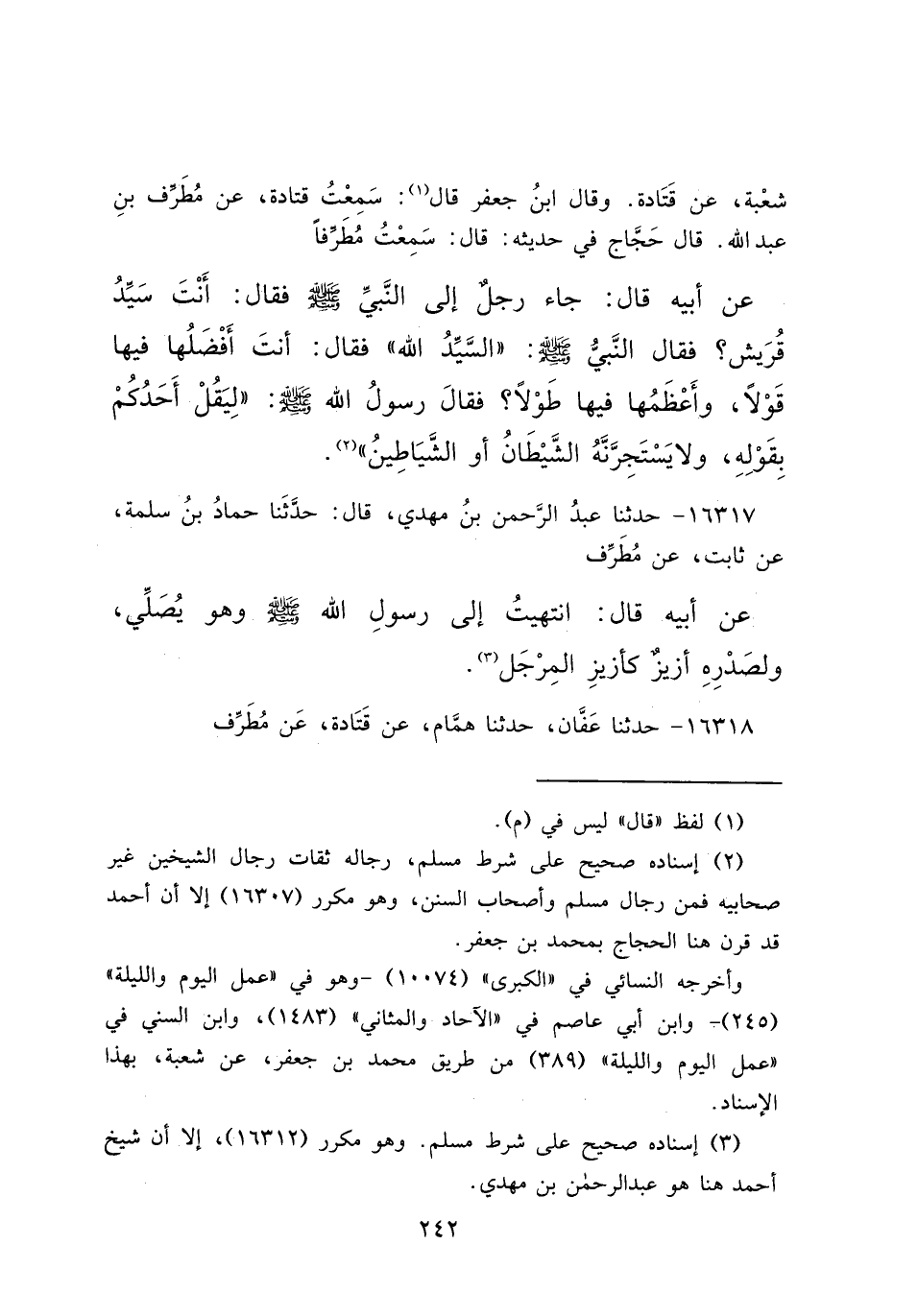 شُعْبَةُ، عَنْ قَتَادَةَ، وَقَالَ: ابْنُ جَعْفَرٍ، قال (١) : سَمِعْتُ قَتَادَةَ، عَنْ مُطَرِّفِ بْنِ عَبْدِ اللهِ قَالَ حَجَّاجٌ فِي حَدِيثِهِ قَالَ: سَمِعْتُ مُطَرِّفًا، عَنْ أَبِيهِ قَالَ: جَاءَ رَجُلٌ إِلَى النَّبِيِّ صَلَّى اللهُ عَلَيْهِ وَسَلَّمَ فَقَالَ: أَنْتَ سَيِّدُ قُرَيْشٍ؟ فَقَالَ النَّبِيُّ صَلَّى اللهُ عَلَيْهِ وَسَلَّمَ: " السَّيِّدُ اللهُ "، فَقَالَ: أَنْتَ أَفْضَلُهَا فِيهَا قَوْلًا، وَأَعْظَمُهَا فِيهَا طَوْلًا؟ فَقَالَ رَسُولُ اللهِ صَلَّى اللهُ عَلَيْهِ وَسَلَّمَ: " لِيَقُلْ أَحَدُكُمْ بِقَوْلِهِ وَلَا يَسْتَجِرَّنَّهُ الشَّيْطَانُ أَوِ الشَّيَاطِينُ " (٢)