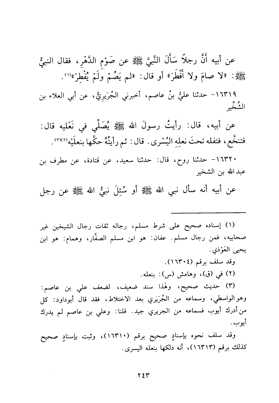 ١٦٣١٩ - حَدَّثَنَا عَلِيُّ بْنُ عَاصِمٍ، أَخْبَرَنِي الْجُرَيْرِيُّ، عَنْ أَبِي الْعَلَاءِ بْنِ الشِّخِّيرِ، عَنْ أَبِيهِ قَالَ: " رَأَيْتُ رَسُولَ اللهِ صَلَّى اللهُ عَلَيْهِ وَسَلَّمَ يُصَلِّي فِي نَعْلَيْهِ " قَالَ: " فَتَنَخَّعَ، فَتَفَلَهُ تَحْتَ نَعْلِهِ الْيُسْرَى "، قَالَ: " ثُمَّ رَأَيْتُهُ حَكَّهَا بِنَعْلَيْهِ (٢) " (٣)