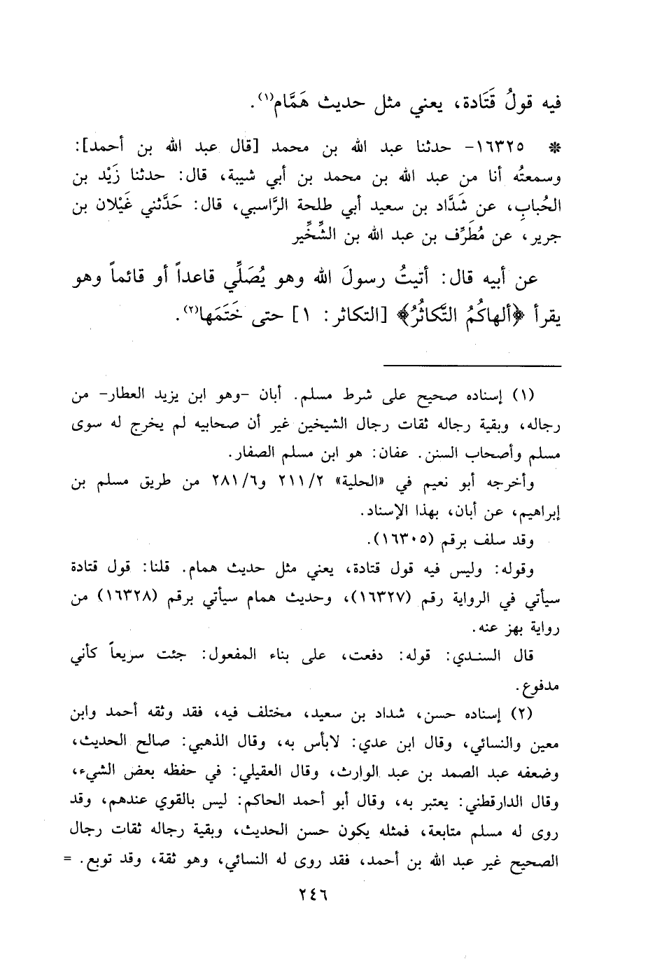 * ١٦٣٢٥ - حَدَّثَنَا عَبْدُ اللهِ بْنُ مُحَمَّدٍ، قَالَ عَبْدُ اللهِ بْنُ أَحْمَدَ: وَسَمِعْتُهُ أَنَا مِنْ عَبْدِ اللهِ بْنِ مُحَمَّدِ بْنِ أَبِي شَيْبَةَ قَالَ: حَدَّثَنَا زَيْدُ بْنُ الْحُبَابِ، عَنْ شَدَّادِ بْنِ سَعِيدٍ أَبِي طَلْحَةَ الرَّاسِبِيِّ قَالَ: حَدَّثَنِي غَيْلَانُ بْنُ جَرِيرٍ، عَنْ مُطَرِّفِ بْنِ عَبْدِ اللهِ بْنِ الشِّخِّيرِ، عَنْ أَبِيهِ قَالَ: " أَتَيْتُ رَسُولَ اللهِ صَلَّى اللهُ عَلَيْهِ وَسَلَّمَ وَهُوَ يُصَلِّي قَاعِدًا أَوْ قَائِمًا وَهُوَ يَقْرَأُ: أَلْهَاكُمُ التَّكَاثُرُ حَتَّى خَتَمَهَا " (٢)