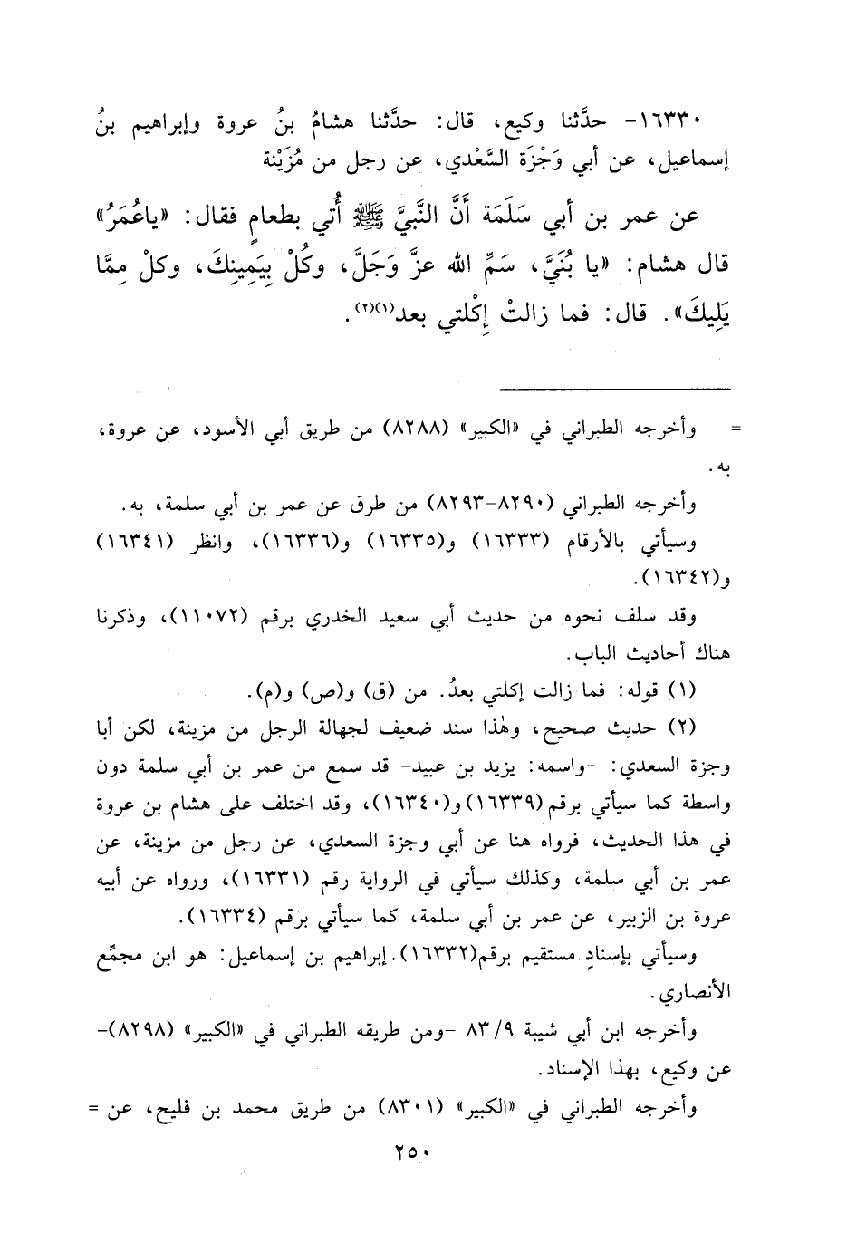 (٢) حديث صحيح، وهذا سند ضعيف لجهالة الرجل من مزينة، لكن أبا وجزة السعدي:- واسمه: يزيد بن عبيد- قد سمع من عمر بن أبي سلمة دون واسطة كما سيأتي برقم (١٦٣٣٩) و (١٦٣٤٠) ، وقد اختلف على هشام بن عروة في هذا الحديث، فرواه هنا عن أبي وجزة السعدي، عن رجل من مزينة، عن عمر بن أبي سلمة، وكذلك سيأتي في الرواية رقم (١٦٣٣١) ، ورواه عن أبيه عروة بن الزبير، عن عمر بن أبي سلمة، كما سيأتي برقم (١٦٣٣٤) .