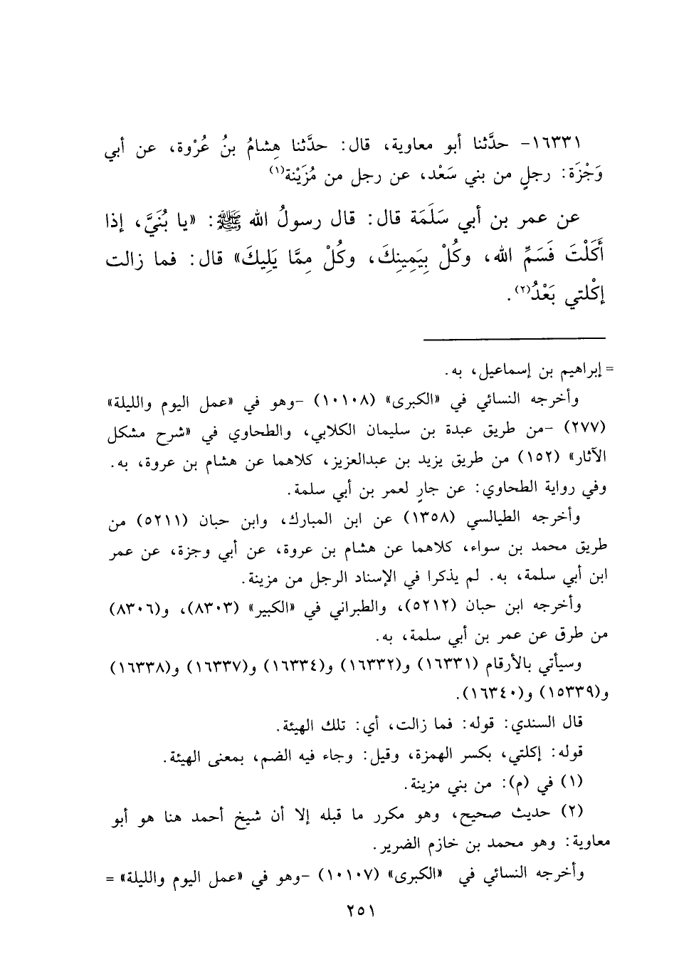 ١٦٣٣١ - حَدَّثَنَا أَبُو مُعَاوِيَةَ، قَالَ: حَدَّثَنَا هِشَامُ بْنُ عُرْوَةَ، عَنْ أَبِي وَجْزَةَ رَجُلٍ مِنْ بَنِي سَعْدٍ، عَنْ رَجُلٍ مِنْ مُزَيْنَةَ، (١) عَنْ عُمَرَ بْنِ أَبِي سَلَمَةَ قَالَ: قَالَ رَسُولُ اللهِ صَلَّى اللهُ عَلَيْهِ وَسَلَّمَ: " يَا بُنَيَّ، إِذَا أَكَلْتَ فَسَمِّ اللهَ، وَكُلْ بِيَمِينِكَ، وَكُلْ مِمَّا يَلِيكَ " قَالَ: فَمَا زَالَتْ إِكْلَتِي بَعْدُ (٢)