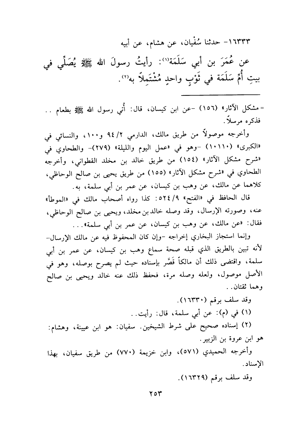 ١٦٣٣٣ - حَدَّثَنَا سُفْيَانُ، عَنْ هِشَامٍ، عَنْ أَبِيهِ، عَنْ عُمَرَ بْنِ أَبِي سَلَمَةَ (١) قَالَ: " رَأَيْتُ رَسُولَ اللهِ صَلَّى اللهُ عَلَيْهِ وَسَلَّمَ يُصَلِّي فِي بَيْتِ أُمِّ سَلَمَةَ فِي ثَوْبٍ وَاحِدٍ مُشْتَمِلًا بِهِ " (٢)
