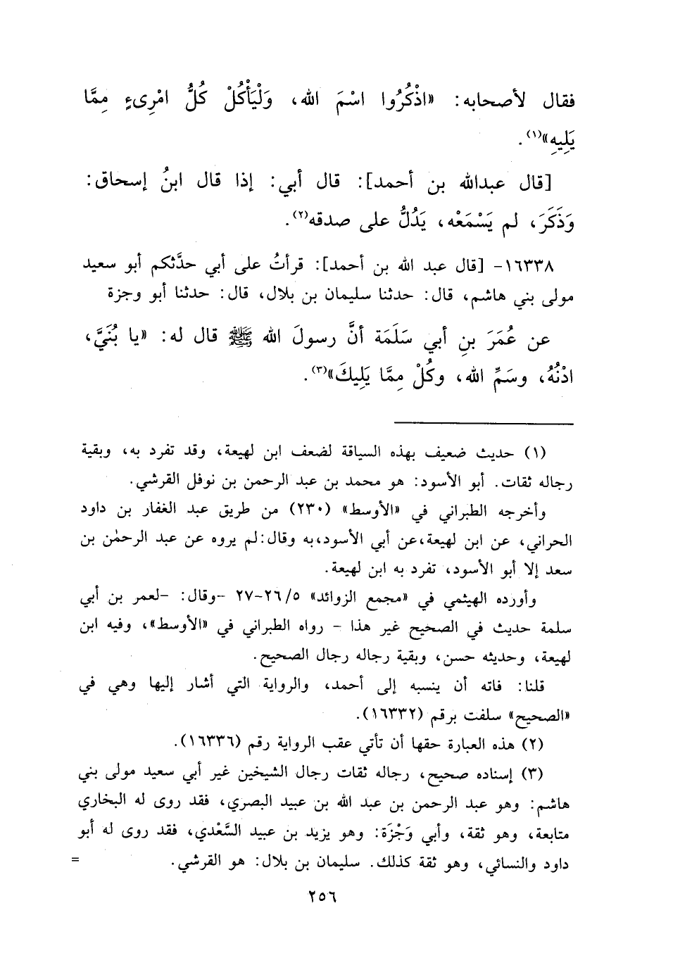 ١٦٣٣٨ - قَرَأْتُ عَلَى أَبِي، حَدَّثَكُمْ أَبُو سَعِيدٍ، مَوْلَى بَنِي هَاشِمٍ، قَالَ: حَدَّثَنَا سُلَيْمَانُ بْنُ بِلَالٍ، قَالَ: حَدَّثَنَا أَبُو وَجْزَةَ، عَنْ عُمَرَ بْنِ أَبِي سَلَمَةَ، أَنَّ رَسُولَ اللهِ صَلَّى اللهُ عَلَيْهِ وَسَلَّمَ قَالَ لَهُ: " يَا بُنَيَّ، ادْنُهْ، وَسَمِّ اللهَ، وَكُلْ مِمَّا يَلِيكَ " (٣)