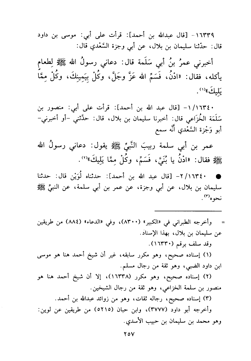 ١٦٣٤٠ - قَالَ عَبْدُ اللهِ بْنُ أَحْمَدَ: قَرَأْتُ عَلَى أَبِي مَنْصُورُ بْنُ سَلَمَةَ الْخُزَاعِيُّ قَالَ: أَخْبَرَنَا سُلَيْمَانُ بْنُ بِلَالٍ قَالَ: حَدَّثَنِي أَوْ أَخْبَرَنِي أَبُو وَجْزَةَ السَّعْدِيُّ، أَنَّهُ سَمِعَ عُمَرَ بْنَ أَبِي سَلَمَةَ رَبِيبَ النَّبِيِّ صَلَّى اللهُ عَلَيْهِ وَسَلَّمَ يَقُولُ: دَعَانِي رَسُولُ اللهِ صَلَّى اللهُ عَلَيْهِ وَسَلَّمَ فَقَالَ: " ادْنُ يَا بُنَيَّ، فَسَمِّ وَكُلْ مِمَّا يَلِيكَ " (٢) ، قَالَ عَبْدُ اللهِ بْنُ أَحْمَدَ حَدَّثَنَاهُ لُوَيْنٌ، قَالَ: حَدَّثَنَا سُلَيْمَانُ بْنُ بِلَالٍ، عَنْ أَبِي وَجْزَةَ، عَنْ عُمَرَ بْنِ أَبِي سَلَمَةَ، عَنِ النَّبِيِّ صَلَّى اللهُ عَلَيْهِ وَسَلَّمَ، نَحْوَهُ (٣)