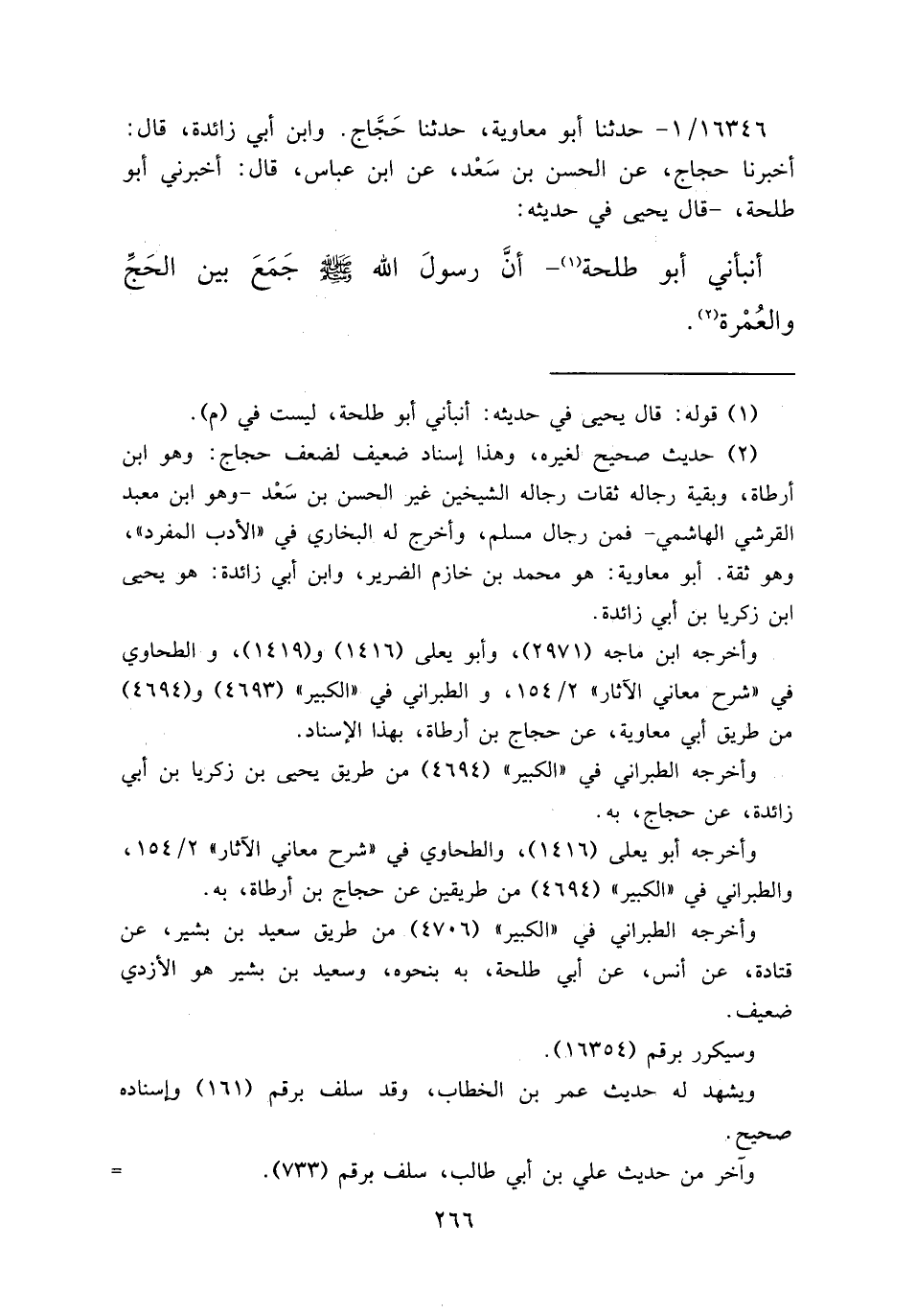 ١٦٣٤٦/١ - حَدَّثَنَا أَبُو مُعَاوِيَةَ، حَدَّثَنَا حَجَّاجٌ، وَابْنُ أَبِي زَائِدَةَ قَالَ: أَخْبَرَنَا حَجَّاجٌ، عَنِ الْحَسَنِ بْنِ سَعْدٍ، عَنِ ابْنِ عَبَّاسٍ قَالَ: أَخْبَرَنِي أَبُو طَلْحَةَ قَالَ يَحْيَى فِي حَدِيثِهِ: أَنْبَأَنِي أَبُو طَلْحَةَ: (١) " أَنَّ رَسُولَ اللهِ صَلَّى اللهُ عَلَيْهِ وَسَلَّمَ جَمَعَ بَيْنَ الْحَجِّ وَالْعُمْرَةِ " (٢)