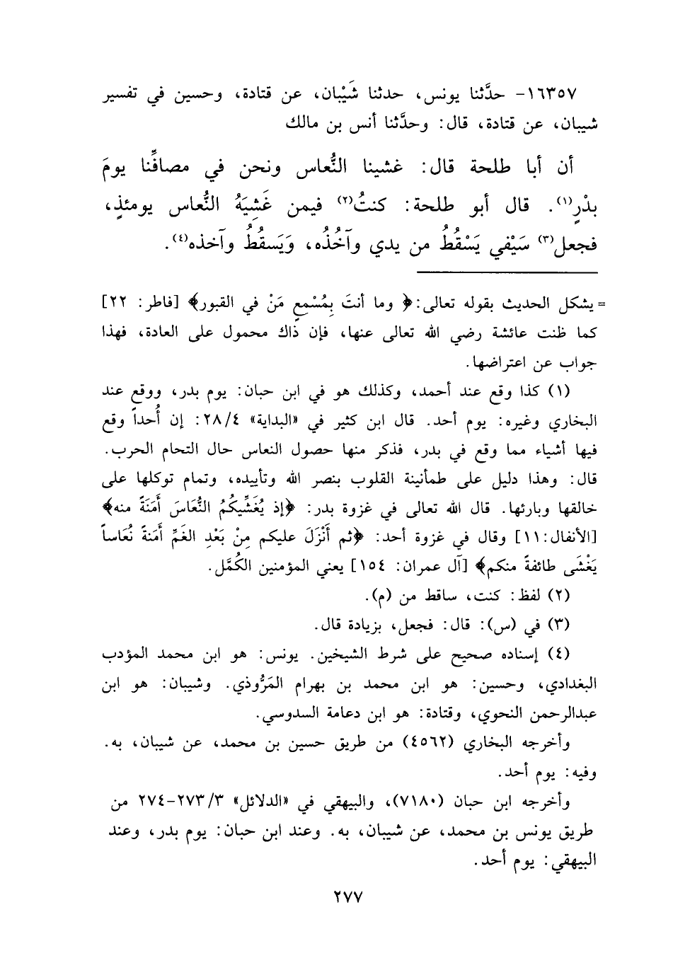 ١٦٣٥٧ - حَدَّثَنَا يُونُسُ، حَدَّثَنَا شَيْبَانُ، وَحُسَيْنٌ، فِي تَفْسِيرِ شَيْبَانَ، عَنْ قَتَادَةَ قَالَ: وَحَدَّثَنَا أَنَسُ بْنُ مَالِكٍ، أَنَّ أَبَا طَلْحَةَ قَالَ: " غَشِيَنَا النُّعَاسُ وَنَحْنُ فِي مَصَافِّنَا يَوْمَ بَدْرٍ (١) ـ قَالَ أَبُو طَلْحَةَ ـ: وَكُنْتُ (٢) فِيمَنْ غَشِيَهُ النُّعَاسُ يَوْمَئِذٍ، فَجَعَلَ (٣) سَيْفِي يَسْقُطُ مِنْ يَدِي وَآخُذُهُ، وَيَسْقُطُ وَآخُذُهُ " (٤)