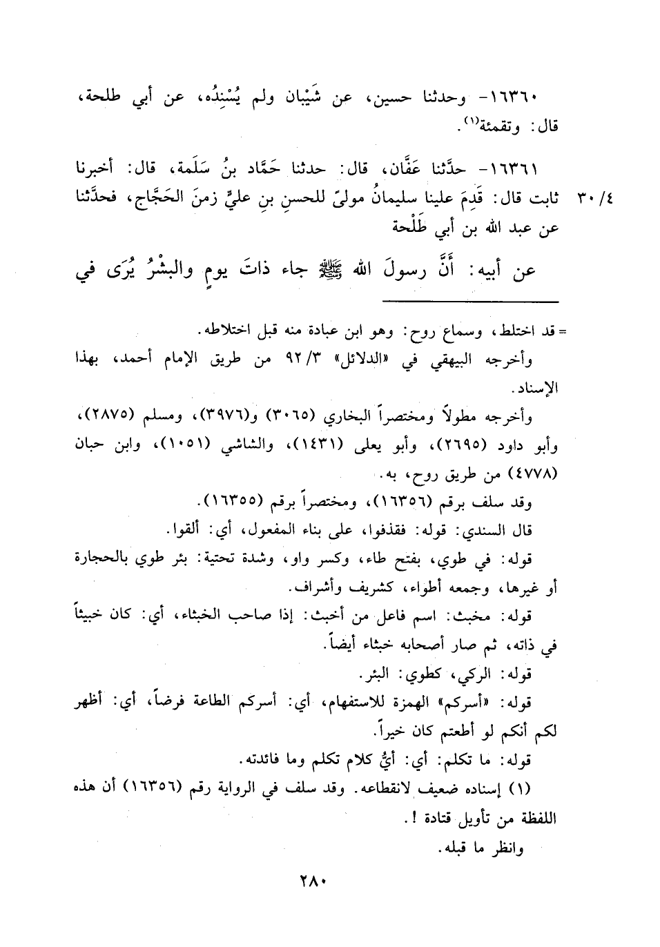 ١٦٣٦٠ - وَحَدَّثَنَا حُسَيْنٌ، عَنْ شَيْبَانَ، وَلَمْ يُسْنِدْهُ عَنْ أَبِي طَلْحَةَ قَالَ: وَتَقْمِئَةً (١)