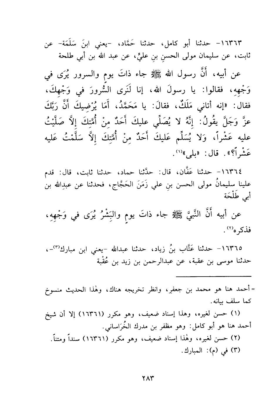 ١٦٣٦٣ - حَدَّثَنَا أَبُو كَامِلٍ، حَدَّثَنَا حَمَّادٌ يَعْنِي ابْنَ سَلَمَةَ، عَنْ ثَابِتٍ، عَنْ سُلَيْمَانَ مَوْلَى الْحَسَنِ بْنِ عَلِيٍّ، عَنْ عَبْدِ اللهِ بْنِ أَبِي طَلْحَةَ، عَنْ أَبِيهِ، أَنَّ رَسُولَ اللهِ صَلَّى اللهُ عَلَيْهِ وَسَلَّمَ جَاءَ ذَاتَ يَوْمٍ وَالسُّرُورُ يُرَى فِي وَجْهِهِ، فَقَالُوا: يَا رَسُولَ اللهِ، إِنَّا لَنَرَى السُّرُورَ فِي وَجْهِكَ، فَقَالَ: " إِنَّهُ أَتَانِي مَلَكٌ فَقَالَ: يَا مُحَمَّدُ، أَمَا يُرْضِيكَ أَنَّ رَبَّكَ عَزَّ وَجَلَّ يَقُولُ: إِنَّهُ لَا يُصَلِّي عَلَيْكَ أَحَدٌ مِنْ أُمَّتِكَ إِلَّا صَلَّيْتُ عَلَيْهِ عَشْرًا، وَلَا يُسَلِّمُ عَلَيْكَ أَحَدٌ مِنْ أُمَّتِكَ إِلَّا سَلَّمْتُ عَلَيْهِ عَشْرًا، قَالَ: بَلَى " (١) ،