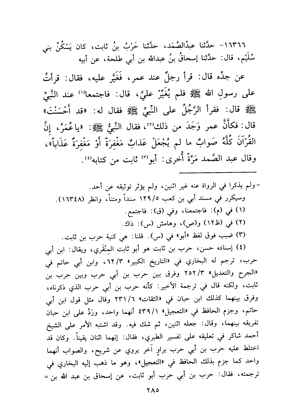 ١٦٣٦٦ - حَدَّثَنَا عَبْدُ الصَّمَدِ، حَدَّثَنَا حَرْبُ بْنُ ثَابِتٍ كَانَ يَسْكُنُ بَنِي سُلَيْمٍ، قَالَ: حَدَّثَنَا إِسْحَاقُ بْنُ عَبْدِ اللهِ بْنِ أَبِي طَلْحَةَ، عَنْ أَبِيهِ، عَنْ جَدِّهِ قَالَ: قَرَأَ رَجُلٌ عِنْدَ عُمَرَ فَغَيَّرَ عَلَيْهِ فَقَالَ: قَرَأْتُ عَلَى رَسُولِ اللهِ صَلَّى اللهُ عَلَيْهِ وَسَلَّمَ فَلَمْ يُغَيِّرْ عَلَيَّ، قَالَ: فَاجْتَمَعْنَا (١) عِنْدَ النَّبِيِّ صَلَّى اللهُ عَلَيْهِ وَسَلَّمَ قَالَ: فَقَرَأَ الرَّجُلُ عَلَى النَّبِيِّ صَلَّى اللهُ عَلَيْهِ وَسَلَّمَ فَقَالَ لَهُ: " قَدْ أَحْسَنْتَ "، قَالَ: فَكَأَنَّ عُمَرَ وَجَدَ مِنْ ذَلِكَ، (٢) فَقَالَ النَّبِيُّ صَلَّى اللهُ عَلَيْهِ وَسَلَّمَ: " يَا عُمَرُ، إِنَّ الْقُرْآنَ كُلَّهُ صَوَابٌ مَا لَمْ يُجْعَلْ عَذَابٌ مَغْفِرَةً أَوْ مَغْفِرَةٌ عَذَابًا "، وَقَالَ عَبْدُ الصَّمَدِ مَرَّةً أُخْرَى أَبُو (٣) ثَابِتٍ مِنْ كِتَابِهِ (٤)