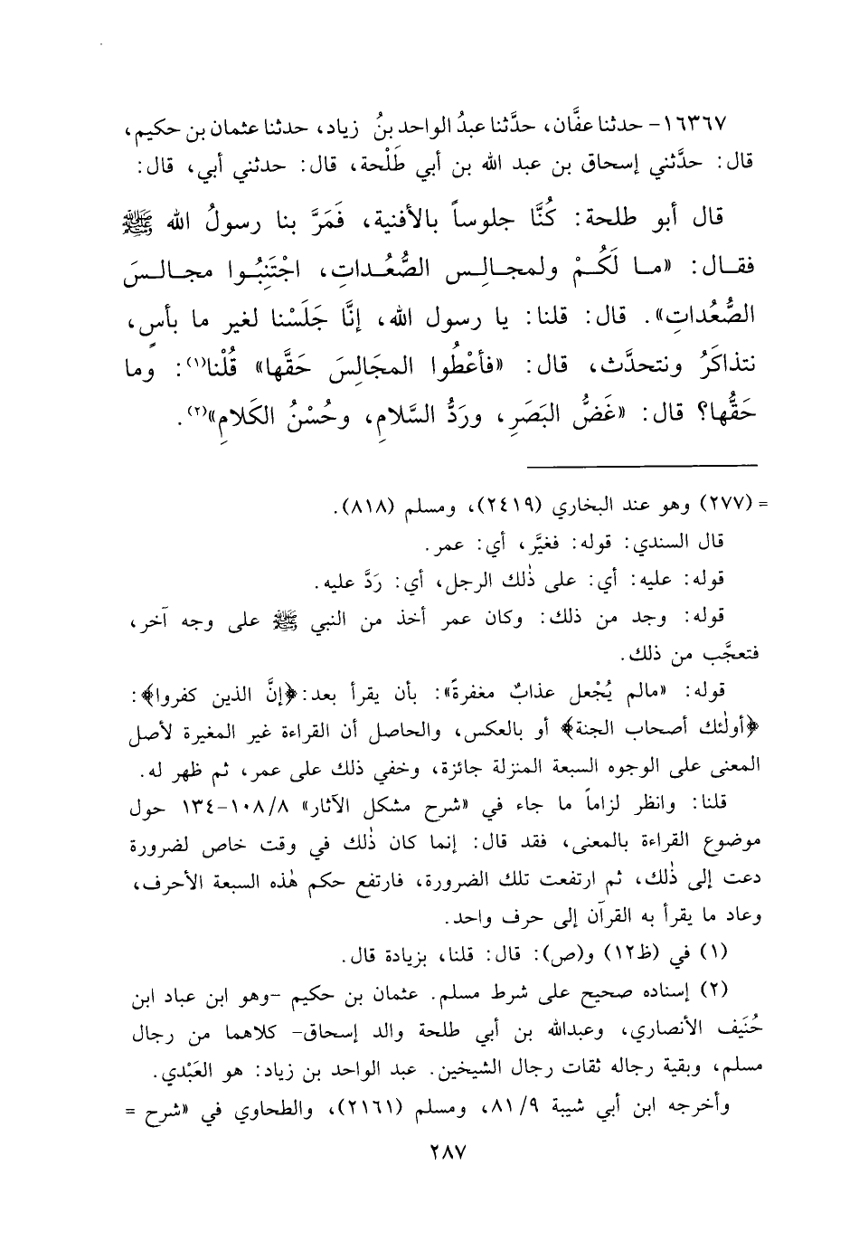 ١٦٣٦٧ - حَدَّثَنَا عَفَّانُ، حَدَّثَنَا عَبْدُ الْوَاحِدِ بْنُ زِيَادٍ، حَدَّثَنَا عُثْمَانُ بْنُ حَكِيمٍ، قَالَ: حَدَّثَنِي إِسْحَاقُ بْنُ عَبْدِ اللهِ بْنِ أَبِي طَلْحَةَ، قَالَ: حَدَّثَنِي أَبِي، قَالَ: قَالَ أَبُو طَلْحَةَ: كُنَّا جُلُوسًا بِالْأَفْنِيَةِ فَمَرَّ بِنَا رَسُولُ اللهِ صَلَّى اللهُ عَلَيْهِ وَسَلَّمَ فَقَالَ: " مَا لَكُمْ وَلِمَجَالِسِ الصُّعُدَاتِ، اجْتَنِبُوا مَجَالِسَ الصُّعُدَاتِ "، قَالَ: قُلْنَا: يَا رَسُولَ اللهِ، إِنَّا جَلَسْنَا لِغَيْرِ مَا بَأْسٍ نَتَذَاكَرُ وَنَتَحَدَّثُ، قَالَ: " فَأَعْطُوا الْمَجَالِسَ حَقَّهَا "، قُلْنَا: (١) وَمَا حَقُّهَا؟ قَالَ: " غَضُّ الْبَصَرِ، وَرَدُّ السَّلَامِ، وَحُسْنُ الْكَلَامِ " (٢)