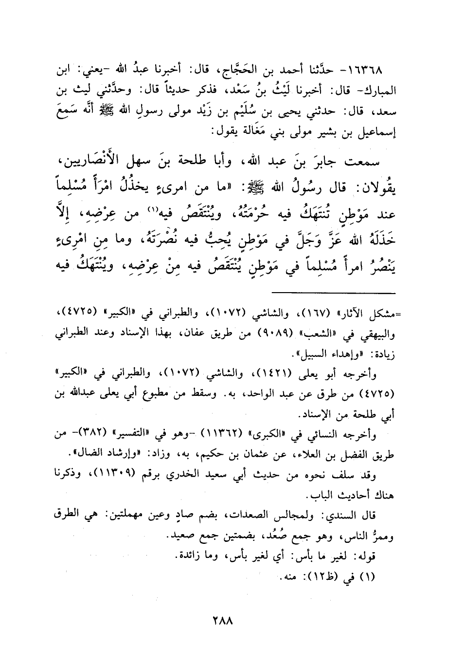 ١٦٣٦٨ - حَدَّثَنَا أَحْمَدُ بْنُ الحَجَّاجِ، قَالَ: أَخْبَرَنَا عَبْدُ اللهِ يَعْنِي ابْنَ الْمُبَارَكِ قَالَ: أَخْبَرَنَا لَيْثُ بْنُ سَعْدٍ فَذَكَرَ حَدِيثًا، قَالَ: وَحَدَّثَنِي لَيْثُ بْنُ سَعْدٍ، قَالَ: حَدَّثَنِي يَحْيَى بْنُ سُلَيْمِ بْنِ زَيْدٍ مَوْلَى رَسُولِ اللهِ صَلَّى اللهُ عَلَيْهِ وَسَلَّمَ، أَنَّهُ سَمِعَ إِسْمَاعِيلَ بْنَ بَشِيرٍ مَوْلَى بَنِي مَغَالَةَ يَقُولُ: سَمِعْتُ جَابِرَ بْنَ عَبْدِ اللهِ وَأَبَا طَلْحَةَ بْنَ سَهْلٍ الْأَنْصَارِيَّيْنِ يَقُولَانِ: قَالَ رَسُولُ اللهِ صَلَّى اللهُ عَلَيْهِ وَسَلَّمَ: " مَا مِنْ امْرِئٍ يَخْذُلُ امْرَأً مُسْلِمًا عِنْدَ مَوْطِنٍ تُنْتَهَكُ فِيهِ حُرْمَتُهُ وَيُنْتَقَصُ فِيهِ (١) مِنْ عِرْضِهِ إِلَّا خَذَلَهُ اللهُ عَزَّ وَجَلَّ فِي مَوْطِنٍ يُحِبُّ فِيهِ نُصْرَتَهُ، وَمَا مِنْ امْرِئٍ يَنْصُرُ امْرَأً مُسْلِمًا فِي مَوْطِنٍ يُنْتَقَصُ فِيهِ مِنْ عِرْضِهِ وَيُنْتَهَكُ فِيهِ