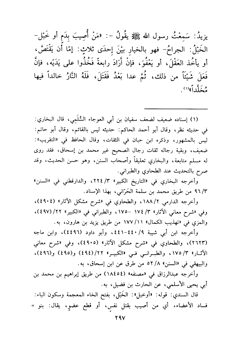 يَزِيدُ ـ سَمِعْتُ رَسُولَ اللهِ صَلَّى اللهُ عَلَيْهِ وَسَلَّمَ يَقُولُ: " مَنْ أُصِيبَ بِدَمٍ أَوْ خَبْلٍ ـ الْخَبْلُ الْجِرَاحُ ـ فَهُوَ بِالْخِيَارِ بَيْنَ إِحْدَى ثَلَاثٍ: إِمَّا أَنْ يَقْتَصَّ، أَوْ يَأْخُذَ الْعَقْلَ، أَوْ يَعْفُوَ، فَإِنْ أَرَادَ رَابِعَةً فَخُذُوا عَلَى يَدَيْهِ، فَإِنْ فَعَلَ شَيْئًا مِنْ ذَلِكَ ثُمَّ عَدَا بَعْدُ فَقَتَلَ فَلَهُ النَّارُ خَالِدًا فِيهَا مُخَلَّدًا " (١)