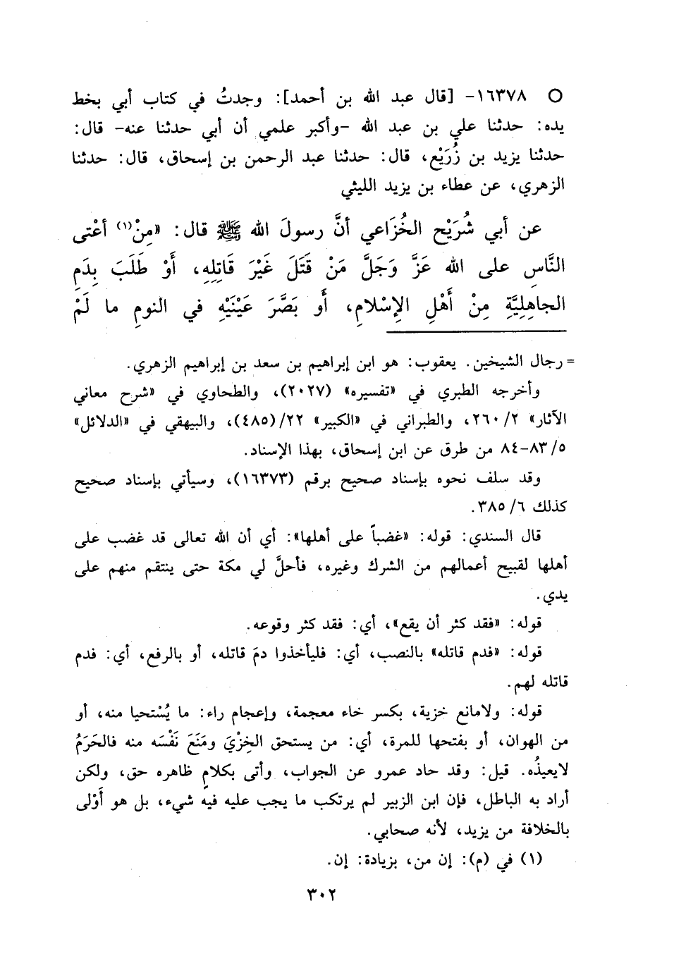 ° ١٦٣٧٨ - قَالَ عَبْدُ اللهِ بْنُ أَحْمَدَ: وَجَدْتُ فِي كِتَابِ أَبِي بِخَطِّ يَدِهِ: حَدَّثَنَا عَلِيُّ بْنُ عَبْدِ اللهِ، وَأَكْبَرُ عِلْمِي أَنَّ أَبِي حَدَّثَنَا عَنْهُ، قَالَ: حَدَّثَنَا يَزِيدُ بْنُ زُرَيْعٍ، قَالَ: حَدَّثَنَا عَبْدُ الرَّحْمَنِ بْنُ إِسْحَاقَ، قَالَ: حَدَّثَنَا الزُّهْرِيُّ، عَنْ عَطَاءِ بْنِ يَزِيدَ اللَّيْثِيِّ، عَنْ أَبِي شُرَيْحٍ الْخُزَاعِيِّ، أَنَّ رَسُولَ اللهِ صَلَّى اللهُ عَلَيْهِ وَسَلَّمَ قَالَ: " مِنْ (١) أَعْتَى النَّاسِ عَلَى اللهِ عَزَّ وَجَلَّ مَنْ قَتَلَ غَيْرَ قَاتِلِهِ، أَوْ طَلَبَ بِدَمِ الْجَاهِلِيَّةِ مِنْ أَهْلِ الْإِسْلَامِ، أَوْ بَصَّرَ عَيْنَيْهِ فِي النَّوْمِ مَا لَمْ