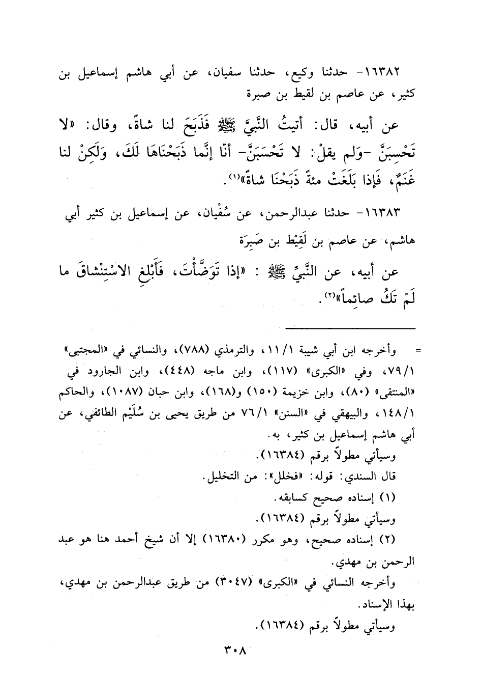 ١٦٣٨٢ - حَدَّثَنَا وَكِيعٌ، حَدَّثَنَا سُفْيَانُ، عَنْ أَبِي هَاشِمٍ إِسْمَاعِيلَ بْنِ كَثِيرٍ، عَنْ عَاصِمِ بْنِ لَقِيطِ بْنِ صَبِرَةَ، عَنْ أَبِيهِ قَالَ: أَتَيْتُ النَّبِيَّ صَلَّى اللهُ عَلَيْهِ وَسَلَّمَ فَذَبَحَ لَنَا شَاةً، وَقَالَ: " لَا تَحْسَبَنَّ ـ وَلَمْ يَقُلْ: لَا تَحْسَبَنَّ ـ أَنَا إِنَّمَا ذَبَحْنَاهَا لَكَ وَلَكِنْ لَنَا غَنَمٌ فَإِذَا بَلَغَتْ مِائَةً ذَبَحْنَا شَاةً " (١)