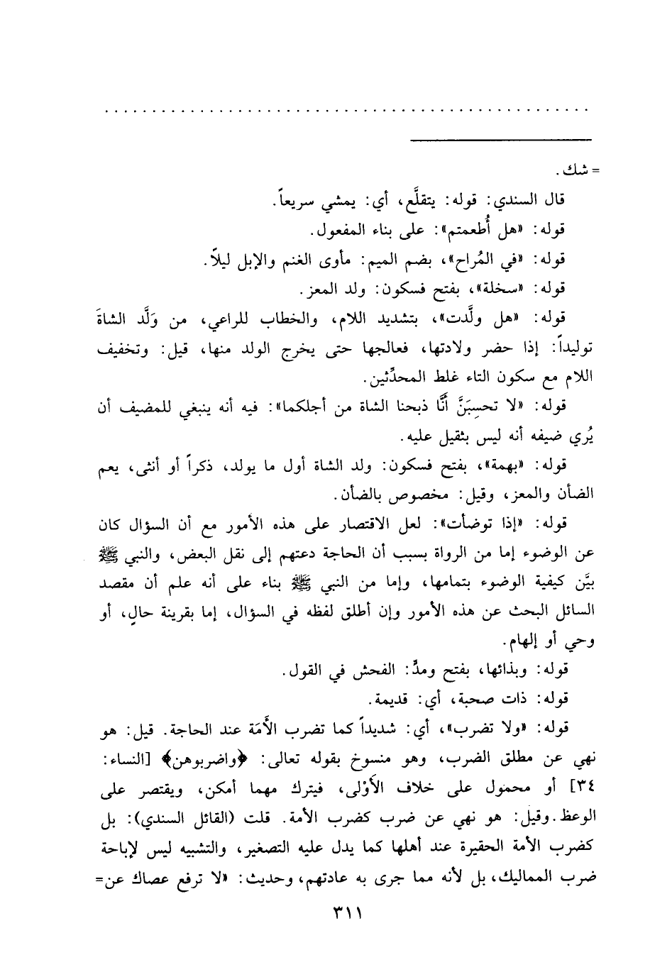 قوله: "ولا تضرب"، أي: شديداَ كما تضرب الأَمَة عند الحاجة. قيل: هو نهي عن مطلق الضرب، وهو منسوخ بقوله تعالى: (واضربوهن) [النساء: ٣٤] أو محمول على خلاف الأَوْلى، فيترك مهما أمكن، ويقتصر على الوعظ. وقيل: هو نهي عن ضرب كضرب الأمة. قلت (القائل السندي) : بل