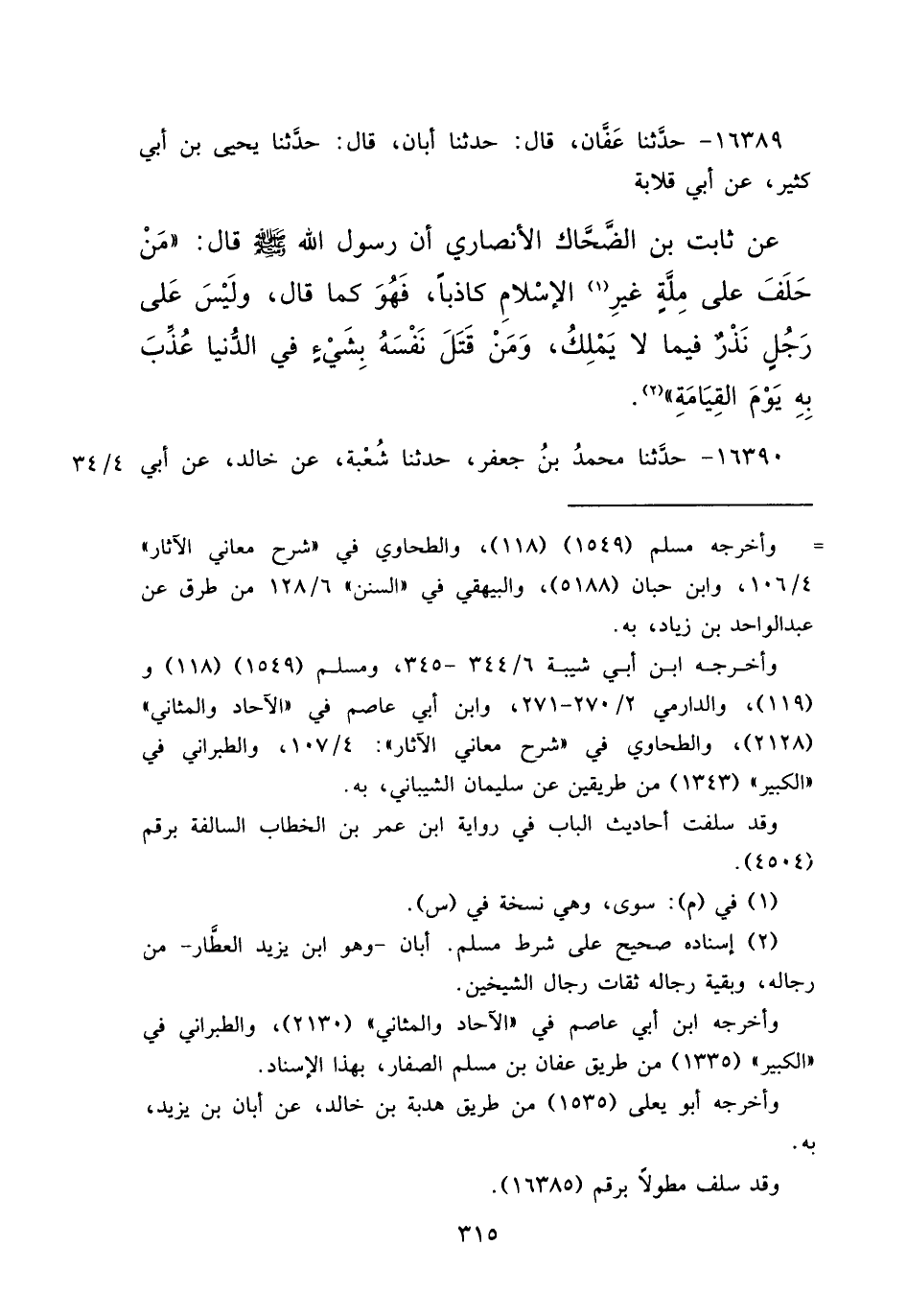 ١٦٣٨٩ - حَدَّثَنَا عَفَّانُ، قَالَ: حَدَّثَنَا أَبَانُ، قَالَ: حَدَّثَنَا يَحْيَى بْنُ أَبِي كَثِيرٍ، عَنْ أَبِي قِلَابَةَ، عَنْ ثَابِتِ بْنِ الضَّحَّاكِ الْأَنْصَارِيِّ، أَنَّ رَسُولَ اللهِ صَلَّى اللهُ عَلَيْهِ وَسَلَّمَ قَالَ: " مَنْ حَلَفَ عَلَى مِلَّةٍ غَيْرِ (١) الْإِسْلَامِ كَاذِبًا فَهُوَ كَمَا قَالَ، وَلَيْسَ عَلَى رَجُلٍ نَذْرٌ فِيمَا لَا يَمْلِكُ، وَمَنْ قَتَلَ نَفْسَهُ بِشَيْءٍ فِي الدُّنْيَا عُذِّبَ بِهِ يَوْمَ الْقِيَامَةِ " (٢)