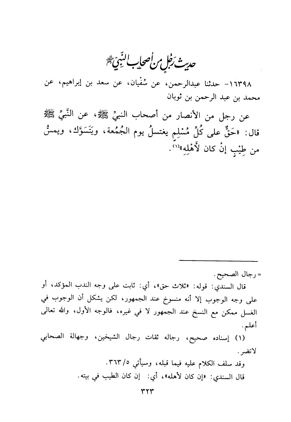 ١٦٣٩٨ - حَدَّثَنَا عَبْدُ الرَّحْمَنِ، عَنْ سُفْيَانَ، عَنْ سَعْدِ بْنِ إِبْرَاهِيمَ، عَنْ مُحَمَّدِ بْنِ عَبْدِ الرَّحْمَنِ بْنِ ثَوْبَانَ، عَنْ رَجُلٍ مِنَ الْأَنْصَارِ مِنْ أَصْحَابِ النَّبِيِّ صَلَّى اللهُ عَلَيْهِ وَسَلَّمَ، عَنِ النَّبِيِّ صَلَّى اللهُ عَلَيْهِ وَسَلَّمَ قَالَ: " حَقٌّ عَلَى كُلِّ مُسْلِمٍ يَغْتَسِلُ يَوْمَ الْجُمُعَةِ وَيَتَسَوَّكُ وَيَمَسُّ مِنْ طِيبٍ إِنْ كَانَ لِأَهْلِهِ " (١)