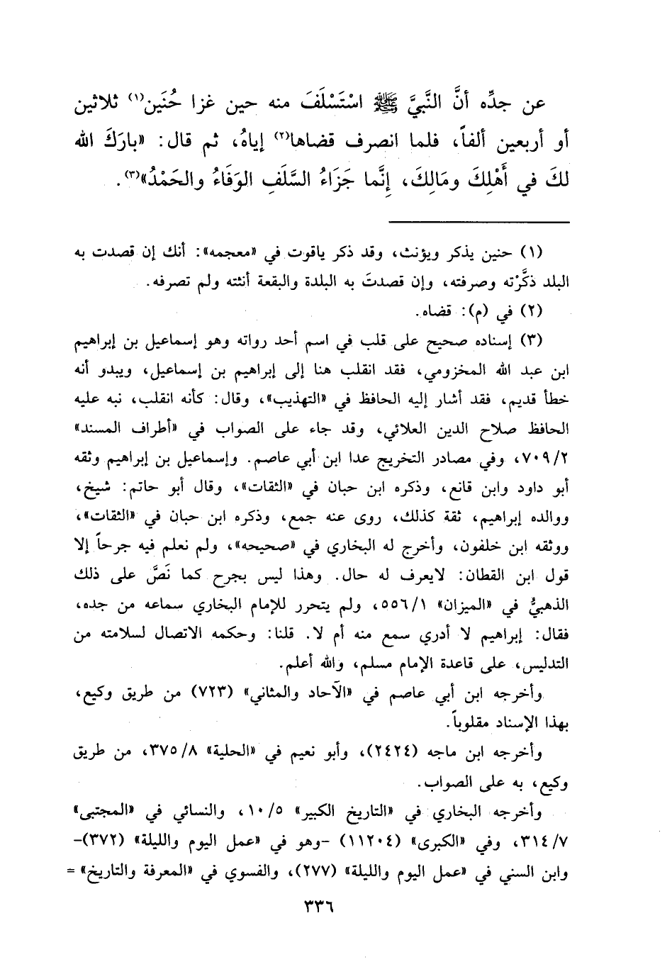 عَنْ جَدِّهِ، أَنَّ النَّبِيَّ صَلَّى اللهُ عَلَيْهِ وَسَلَّمَ اسْتَسْلَفَ مِنْهُ حِينَ غَزَا حُنَيْنًا (١) ثَلَاثِينَ أَوْ أَرْبَعِينَ أَلْفًا، فَلَمَّا انْصَرَفَ قَضَاهَا (٢) إِيَّاهُ، ثُمَّ قَالَ: " بَارَكَ اللهُ لَكَ فِي أَهْلِكَ وَمَالِكَ، إِنَّمَا جَزَاءُ السَّلَفِ الْوَفَاءُ وَالْحَمْدُ " (٣)