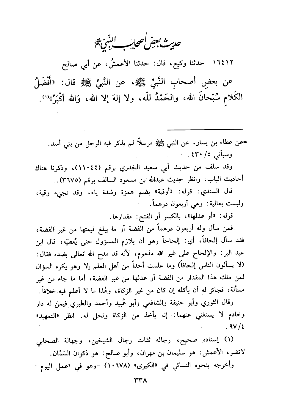 ١٦٤١٢ - حَدَّثَنَا وَكِيعٌ، قَالَ: حَدَّثَنَا الْأَعْمَشُ، عَنْ أَبِي صَالِحٍ، عَنْ بَعْضِ أَصْحَابِ النَّبِيِّ صَلَّى اللهُ عَلَيْهِ وَسَلَّمَ، عَنِ النَّبِيِّ صَلَّى اللهُ عَلَيْهِ وَسَلَّمَ قَالَ: " أَفْضَلُ الْكَلَامِ سُبْحَانَ اللهِ، وَالْحَمْدُ لِلَّهِ، وَلَا إِلَهَ إِلَّا اللهُ، وَاللهُ أَكْبَرُ " (١)