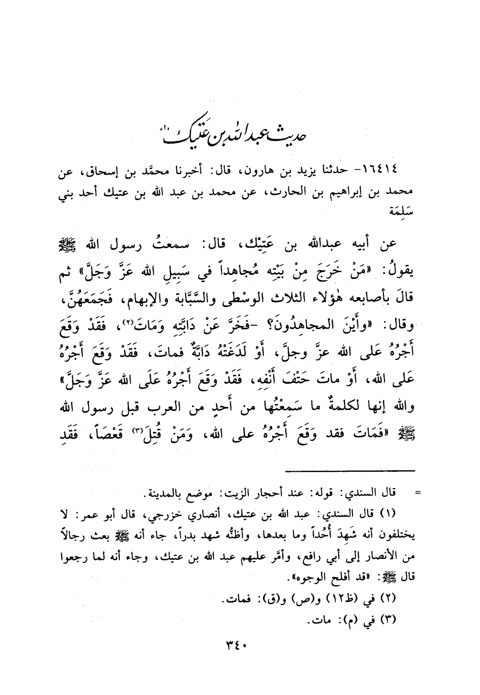 ١٦٤١٤ - حَدَّثَنَا يَزِيدُ بْنُ هَارُونَ، قَالَ: أَخْبَرَنَا مُحَمَّدُ بْنُ إِسْحَاقَ، عَنْ مُحَمَّدِ بْنِ إِبْرَاهِيمَ بْنِ الْحَارِثِ، عَنْ مُحَمَّدِ بْنِ عَبْدِ اللهِ بْنِ عَتِيكٍ أَحَدِ بَنِي سَلِمَةَ، عَنْ أَبِيهِ عَبْدِ اللهِ بْنِ عَتِيكٍ قَالَ: سَمِعْتُ رَسُولَ اللهِ صَلَّى اللهُ عَلَيْهِ وَسَلَّمَ يَقُولُ: " مَنْ خَرَجَ مِنْ بَيْتِهِ مُجَاهِدًا فِي سَبِيلِ اللهِ عَزَّ وَجَلَّ ـ ثُمَّ قَالَ: بِأَصَابِعِهِ هَؤُلَاءِ الثَّلَاثِ: الْوُسْطَى وَالسَّبَّابَةِ وَالْإِبْهَامِ، فَجَمَعَهُنَّ وَقَالَ: وَأَيْنَ الْمُجَاهِدُونَ؟ ـ فَخَرَّ عَنْ دَابَّتِهِ وَمَاتَ (٢) فَقَدْ وَقَعَ أَجْرُهُ عَلَى اللهِ عَزَّ وَجَلَّ، أَوْ لَدَغَتْهُ دَابَّةٌ فَمَاتَ فَقَدْ وَقَعَ أَجْرُهُ عَلَى اللهِ، أَوْ مَاتَ حَتْفَ أَنْفِهِ فَقَدْ وَقَعَ أَجْرُهُ عَلَى اللهِ عَزَّ وَجَلَّ "، وَاللهِ إِنَّهَا لَكَلِمَةٌ مَا سَمِعْتُهَا مِنْ أَحَدٍ مِنَ الْعَرَبِ قَبْلَ رَسُولِ اللهِ صَلَّى اللهُ عَلَيْهِ وَسَلَّمَ: " فَمَاتَ فَقَدْ وَقَعَ أَجْرُهُ عَلَى اللهِ، وَمَنْ قُتِلَ (٣) قَعْصًا فَقَدِ