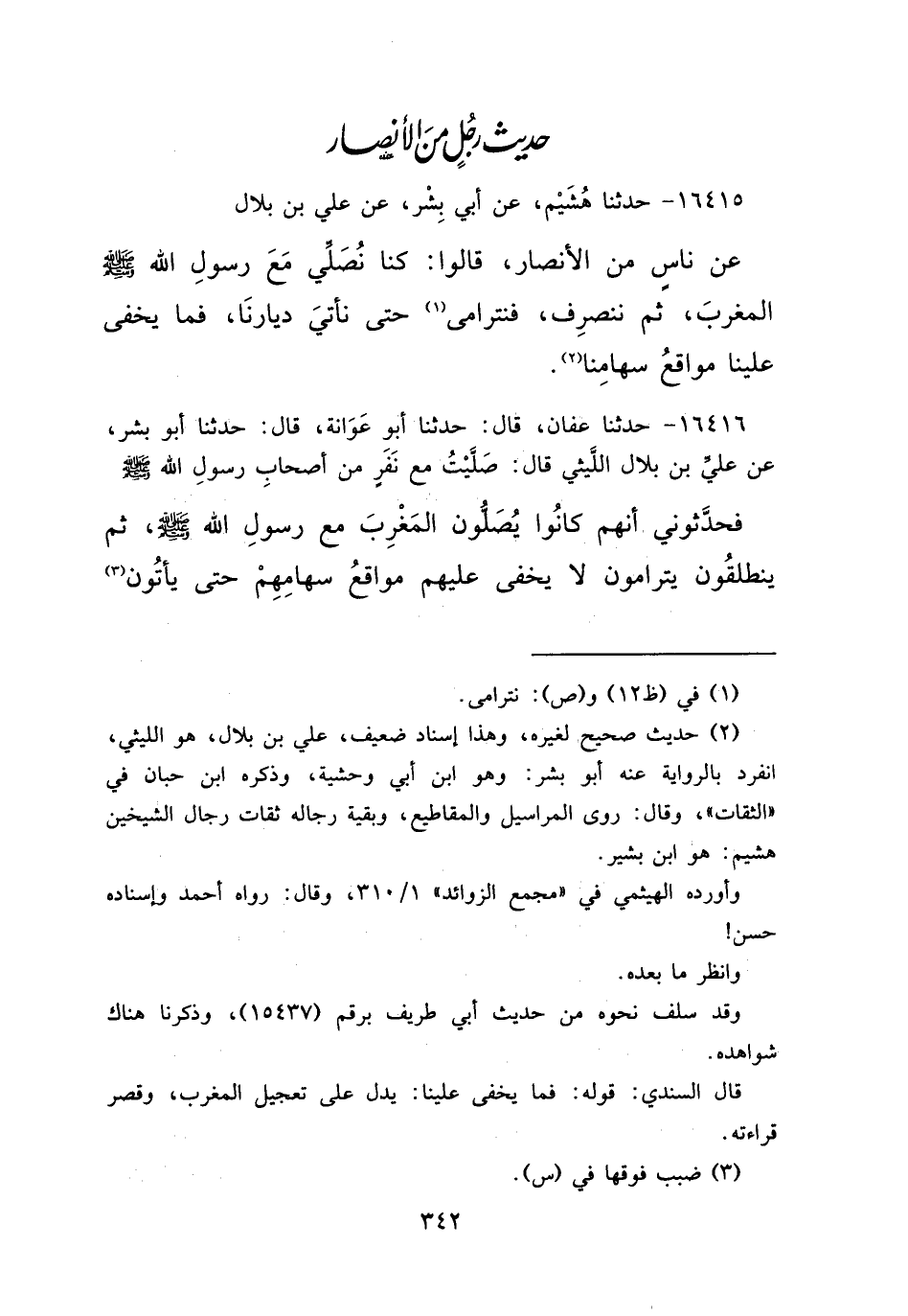 ١٦٤١٥ - حَدَّثَنَا هُشَيْمٌ، عَنْ أَبِي بِشْرٍ، عَنْ عَلِيِّ بْنِ بِلَالٍ، عَنْ نَاسٍ مِنَ الْأَنْصَارِ قَالُوا: " كُنَّا نُصَلِّي مَعَ رَسُولِ اللهِ صَلَّى اللهُ عَلَيْهِ وَسَلَّمَ الْمَغْرِبَ، ثُمَّ نَنْصَرِفُ فَنَتَرَامَى (١) حَتَّى نَأْتِيَ دِيَارَنَا فَمَا يَخْفَى عَلَيْنَا مَوَاقِعُ سِهَامِنَا " (٢)