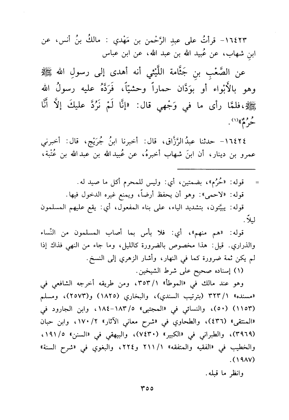 ١٦٤٢٣ - قَرَأْتُ عَلَى عَبْدِ الرَّحْمَنِ بْنِ مَهْدِيٍّ عَنْ مَالِكُ بْنُ أَنَسٍ، عَنِ ابْنِ شِهَابٍ، عَنْ عُبَيْدِ اللهِ بْنِ عَبْدِ اللهِ، عَنِ ابْنِ عَبَّاسٍ، عَنِ الصَّعْبِ بْنِ جَثَّامَةَ اللَّيْثِيِّ، أَنَّهُ أَهْدَى إِلَى رَسُولِ اللهِ صَلَّى اللهُ عَلَيْهِ وَسَلَّمَ وَهُوَ بِالْأَبْوَاءِ أَوْ بِوَدَّانَ حِمَارًا وَحْشِيًّا، فَرَدَّهُ عَلَيْهِ رَسُولُ اللهِ صَلَّى اللهُ عَلَيْهِ وَسَلَّمَ، فَلَمَّا رَأَى مَا فِي وَجْهِي قَالَ: " إِنَّا لَمْ نَرُدَّ عَلَيْكَ إِلَّا أَنَّا حُرُمٌ " (١)