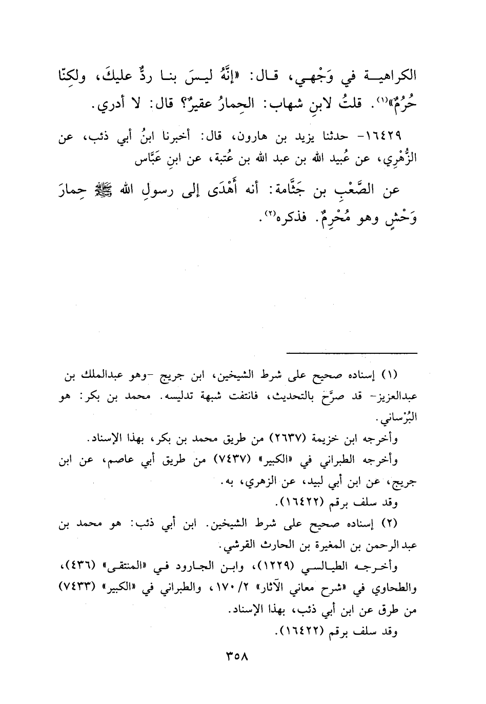 ١٦٤٢٩ - حَدَّثَنَا يَزِيدُ بْنُ هَارُونَ، قَالَ: أَخْبَرَنَا ابْنُ أَبِي ذِئْبٍ، عَنِ الزُّهْرِيِّ، عَنْ عُبَيْدِ اللهِ بْنِ عَبْدِ اللهِ بْنِ عُتْبَةَ، عَنِ ابْنِ عَبَّاسٍ، عَنِ الصَّعْبِ بْنِ جَثَّامَةَ، أَنَّهُ أَهْدَى إِلَى رَسُولِ اللهِ صَلَّى اللهُ عَلَيْهِ وَسَلَّمَ حِمَارَ وَحْشٍ وَهُوَ مُحْرِمٌ، فَذَكَرَهُ (٢)