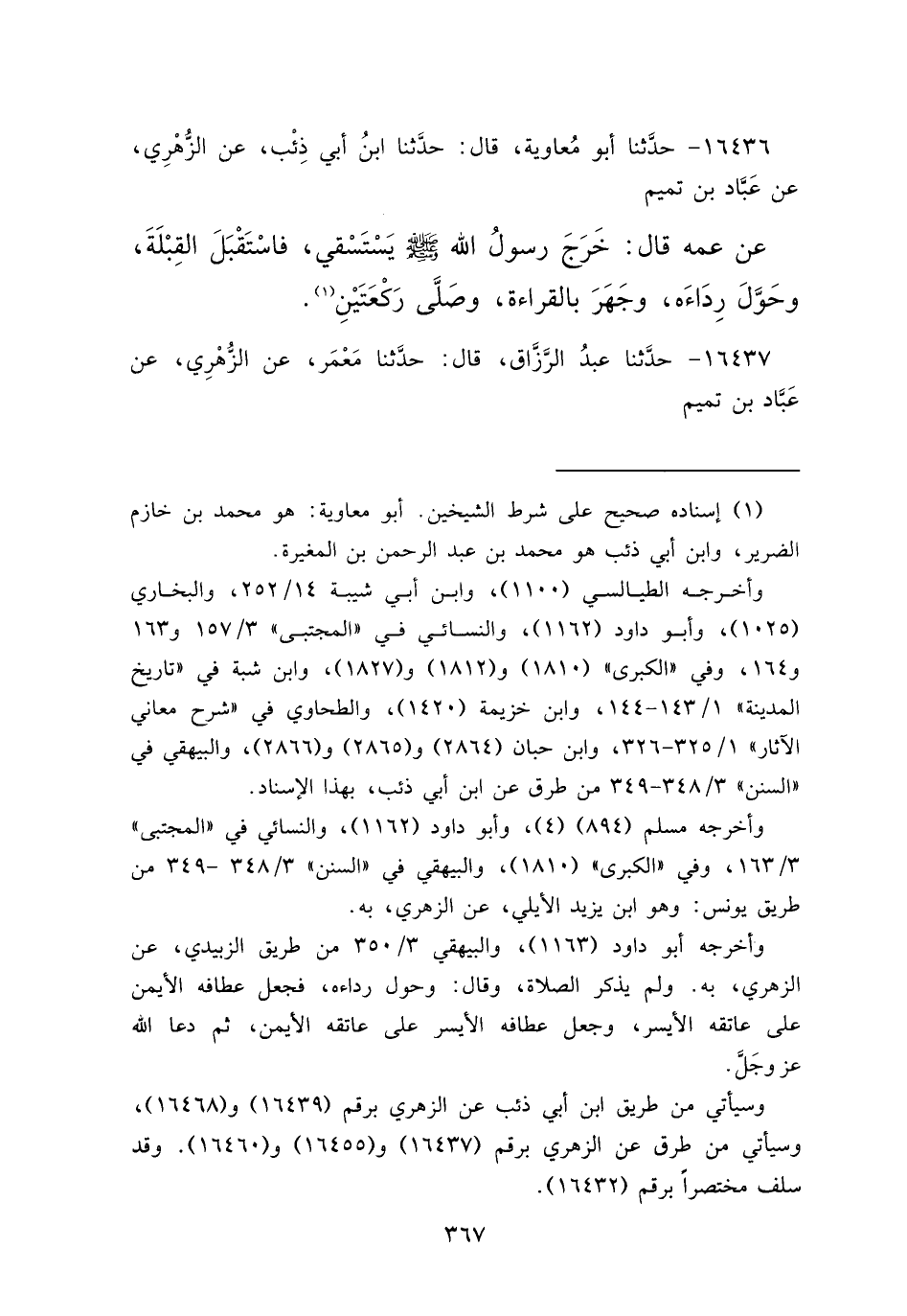 ١٦٤٣٦ - حَدَّثَنَا أَبُو مُعَاوِيَةَ، قَالَ: حَدَّثَنَا ابْنُ أَبِي ذِئْبٍ، عَنِ الزُّهْرِيِّ، عَنْ عَبَّادِ بْنِ تَمِيمٍ، عَنْ عَمِّهِ قَالَ: " خَرَجَ رَسُولُ اللهِ صَلَّى اللهُ عَلَيْهِ وَسَلَّمَ يَسْتَسْقِي فَاسْتَقْبَلَ الْقِبْلَةَ وَحَوَّلَ رِدَاءَهُ، وَجَهَرَ بِالْقِرَاءَةِ وَصَلَّى رَكْعَتَيْنِ " (١)