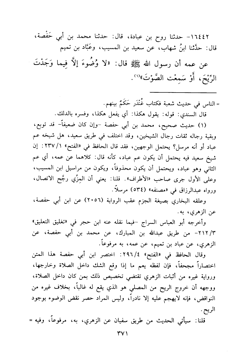 ١٦٤٤٢ - حَدَّثَنَا رَوْحُ بْنُ عُبَادَةَ، قَالَ: حَدَّثَنَا مُحَمَّدُ بْنُ أَبِي حَفْصَةَ، قَالَ: حَدَّثَنَا ابْنُ شِهَابٍ، عَنْ سَعِيدِ بْنِ الْمُسَيِّبِ، وَعَبَّادِ بْنِ تَمِيمٍ، عَنْ عَمِّهِ، أَنَّ رَسُولَ اللهِ صَلَّى اللهُ عَلَيْهِ وَسَلَّمَ قَالَ: " لَا وُضُوءَ إِلَّا فِيمَا وَجَدْتَ الرِّيحَ أَوْ سَمِعْتَ الصَّوْتَ " (١)